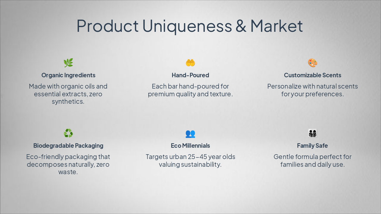 { "features": [ { "icon": "πΏ", "heading": "Organic Ingredients", "description": "Made with organic oils and essential extracts, zero synthetics." }, { "icon": "π€²", "heading": "Hand-Poured", "description": "Each bar hand-poured for premium quality and texture." }, { "icon": "π¨", "heading": "Customizable Scents", "description": "Personalize with natural scents for your preferences." }, { "icon": "β»οΈ", "heading": "Biodegradable Packaging", "description": "Eco-friendly packaging that decomposes naturally, zero waste." }, { "icon": "π₯", "heading": "Eco Millennials", "description": "Targets urban 25-45 year olds valuing sustainability." }, { "icon": "π¨βπ©βπ§βπ¦", "heading": "Family Safe", "description": "Gentle formula perfect for families and daily use." } ] }