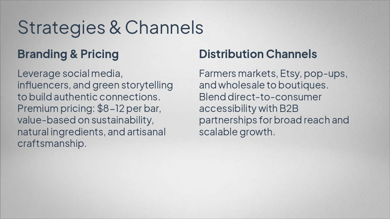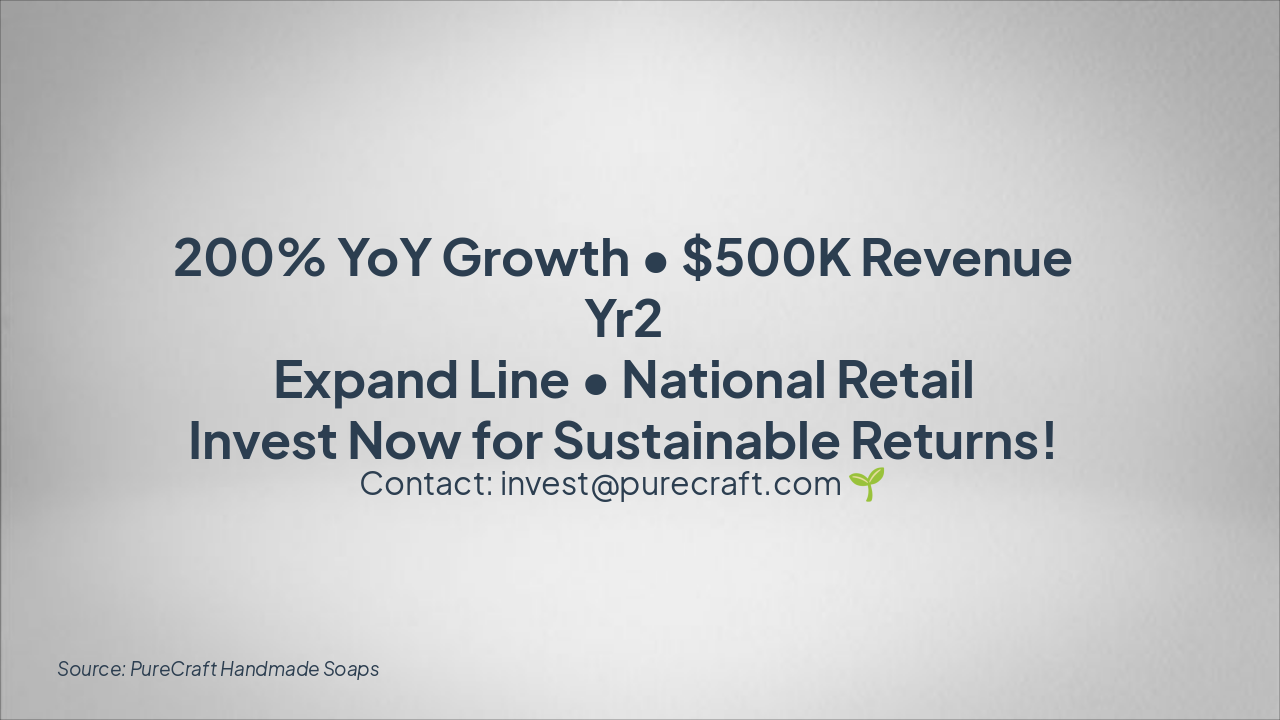 This slide highlights the product's unique features: organic ingredients, hand-poured bars, customizable natural scents, and biodegradable packaging. It targets eco-conscious urban millennials (25-45) with a family-safe, gentle formula.