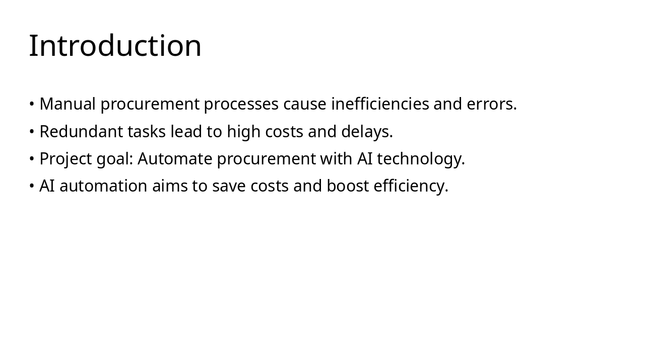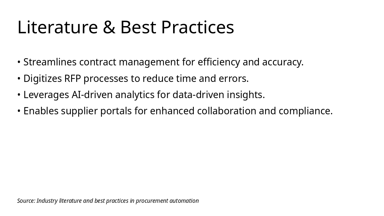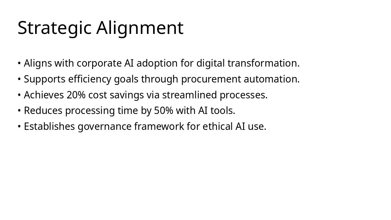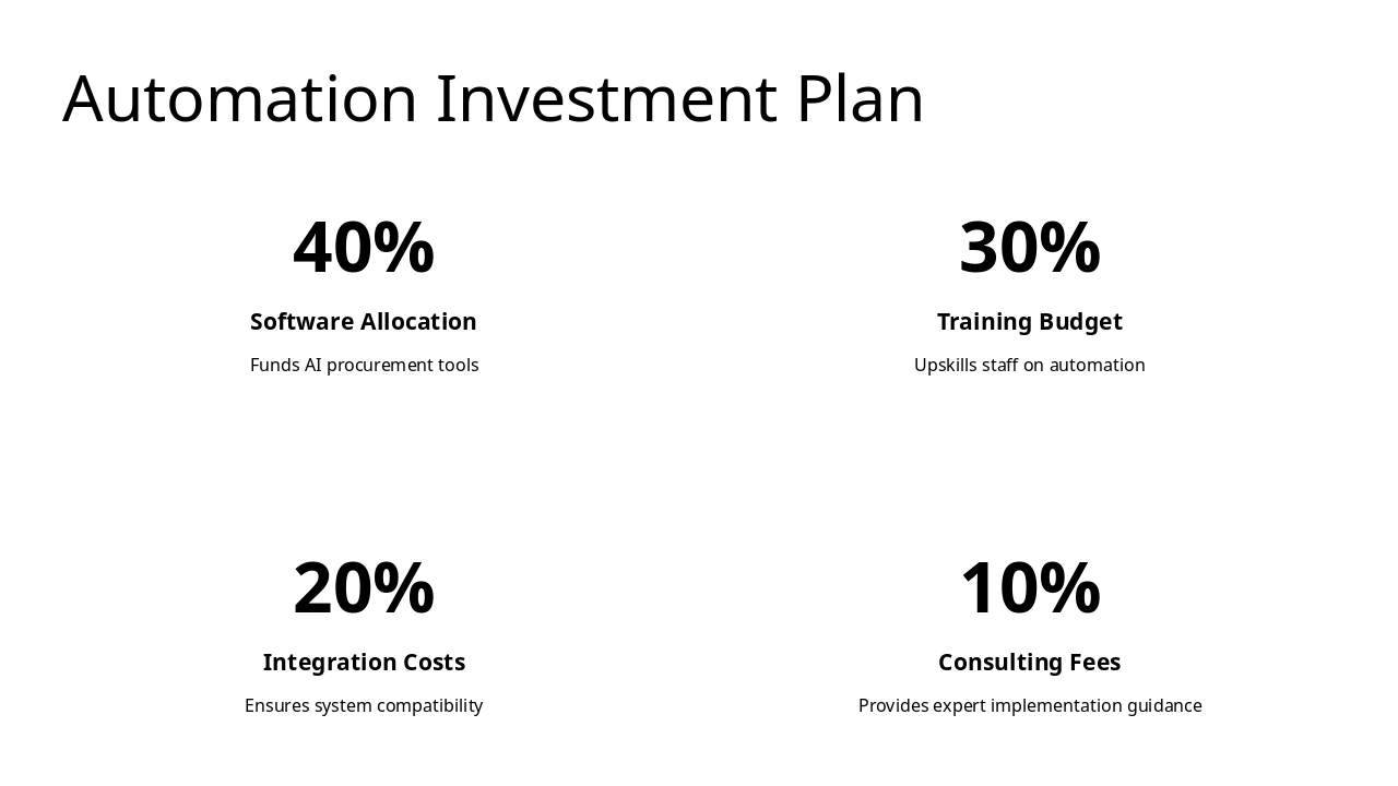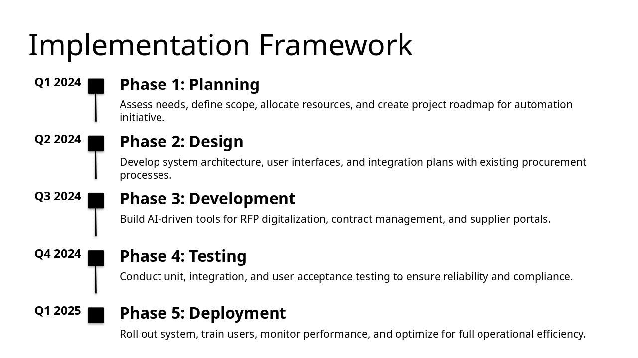 Q1 2024: Phase 1: Planning Assess needs, define scope, allocate resources, and create project roadmap for automation initiative. Q2 2024: Phase 2: Design Develop system architecture, user interfaces, and integration plans with existing procurement processes. Q3 2024: Phase 3: Development Build AI-driven tools for RFP digitalization, contract management, and supplier portals. Q4 2024: Phase 4: Testing Conduct unit, integration, and user acceptance testing to ensure reliability and compliance. Q1 2025: Phase 5: Deployment Roll out system, train users, monitor performance, and optimize for full operational efficiency.