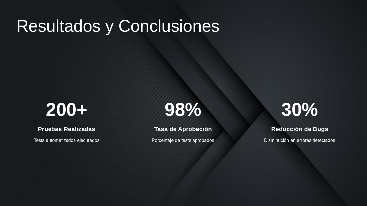 The "Resultados y Conclusiones" slide highlights over 200 automated tests performed with a 98% approval rate. It also reports a 30% reduction in detected bugs.