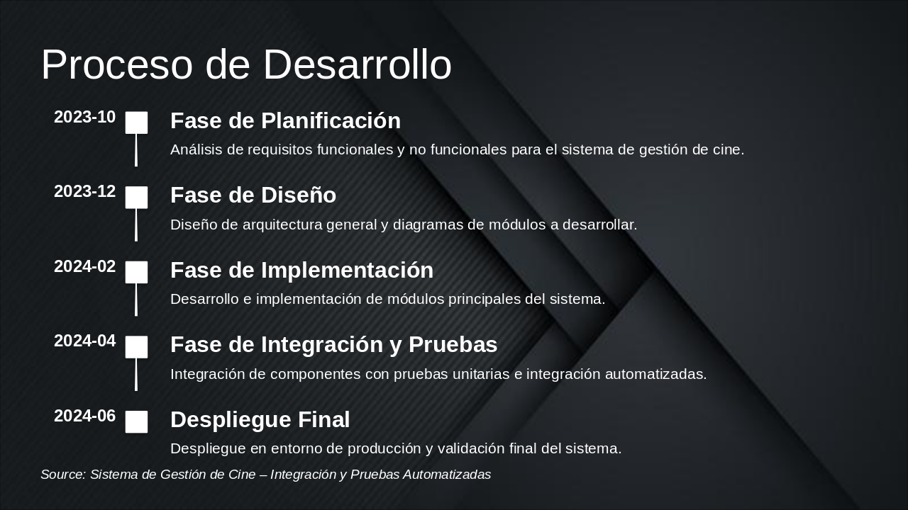 2023-10: Fase de Planificación Análisis de requisitos funcionales y no funcionales para el sistema de gestión de cine. 2023-12: Fase de Diseño Diseño de arquitectura general y diagramas de módulos a desarrollar. 2024-02: Fase de Implementación Desarrollo e implementación de módulos principales del sistema. 2024-04: Fase de Integración y Pruebas Integración de componentes con pruebas unitarias e integración automatizadas. 2024-06: Despliegue Final Despliegue en entorno de producción y validación final del sistema.