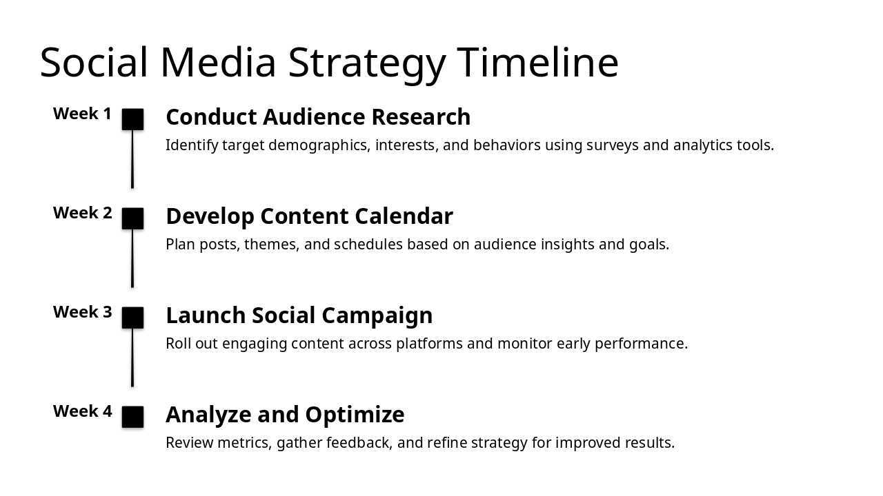 Week 1: Conduct Audience Research Identify target demographics, interests, and behaviors using surveys and analytics tools. Week 2: Develop Content Calendar Plan posts, themes, and schedules based on audience insights and goals. Week 3: Launch Social Campaign Roll out engaging content across platforms and monitor early performance. Week 4: Analyze and Optimize Review metrics, gather feedback, and refine strategy for improved results.