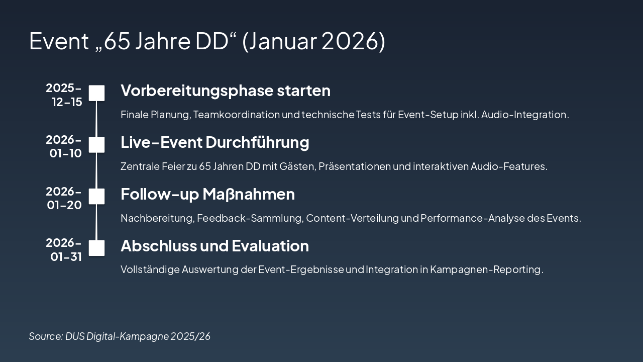 2025-12-15: Vorbereitungsphase starten Finale Planung, Teamkoordination und technische Tests für Event-Setup inkl. Audio-Integration. 2026-01-10: Live-Event Durchführung Zentrale Feier zu 65 Jahren DD mit Gästen, Präsentationen und interaktiven Audio-Features. 2026-01-20: Follow-up Maßnahmen Nachbereitung, Feedback-Sammlung, Content-Verteilung und Performance-Analyse des Events. 2026-01-31: Abschluss und Evaluation Vollständige Auswertung der Event-Ergebnisse und Integration in Kampagnen-Reporting.