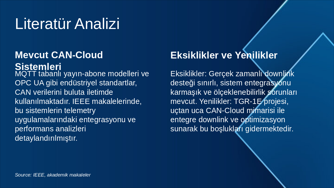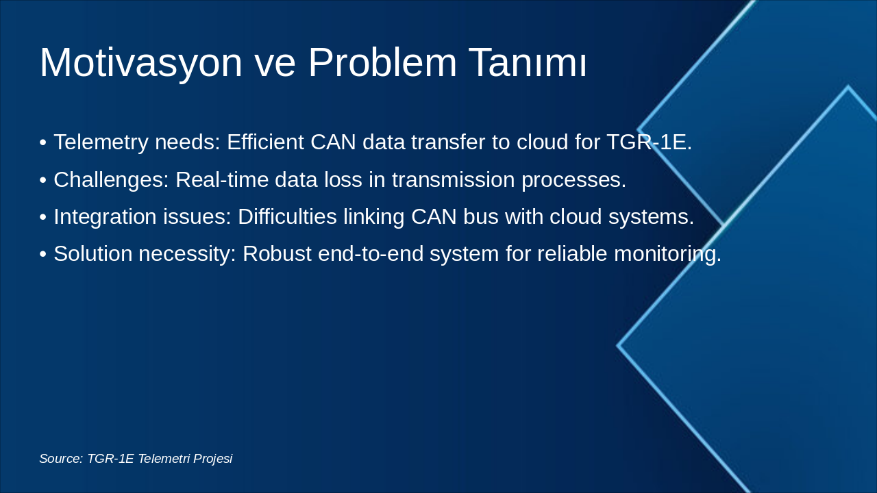 The slide is titled "TGR-1E Telemetri Projesi," presenting a project focused on telemetry systems. Its subtitle describes an end-to-end solution from CAN to the cloud.
