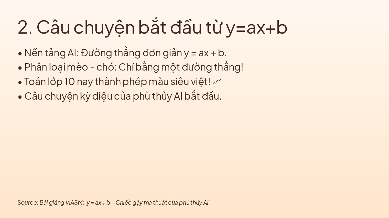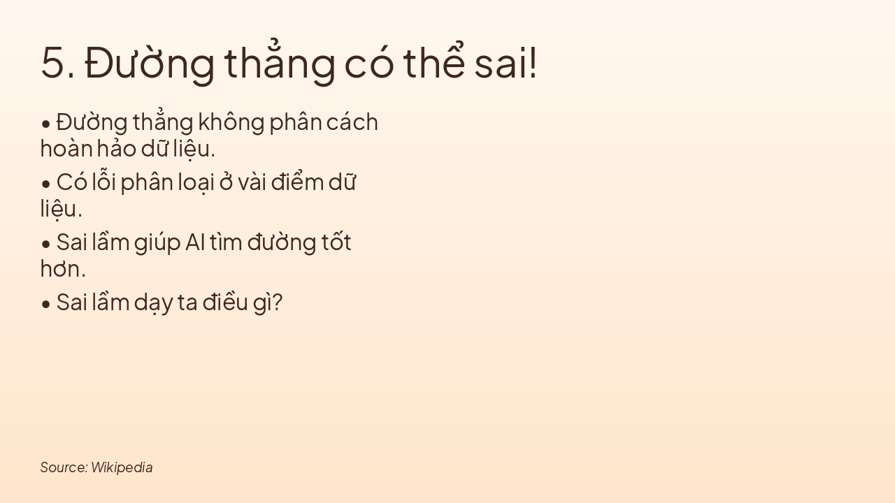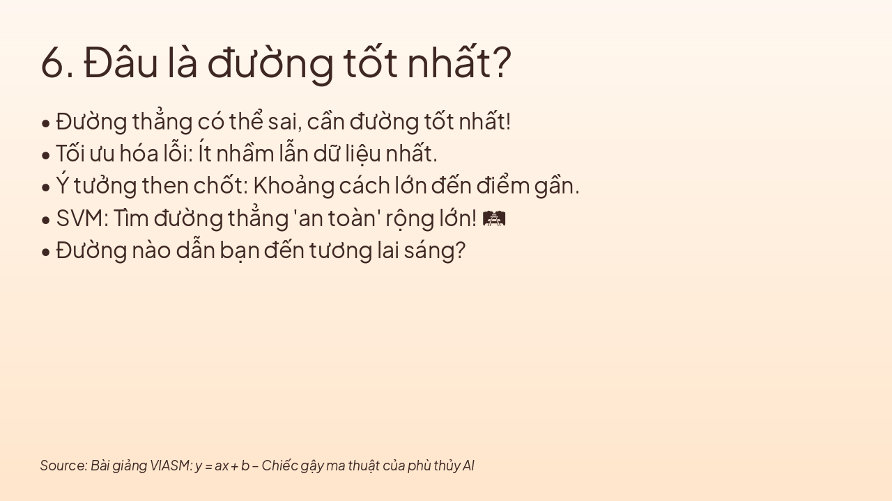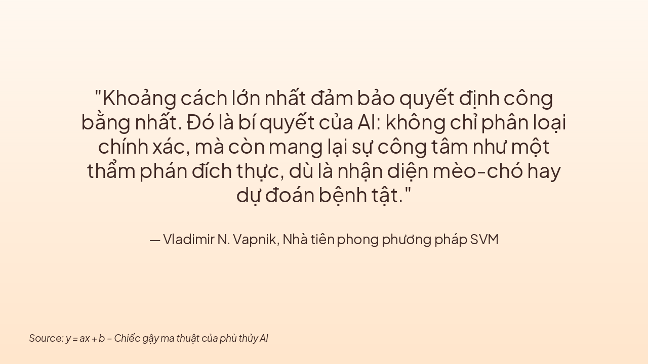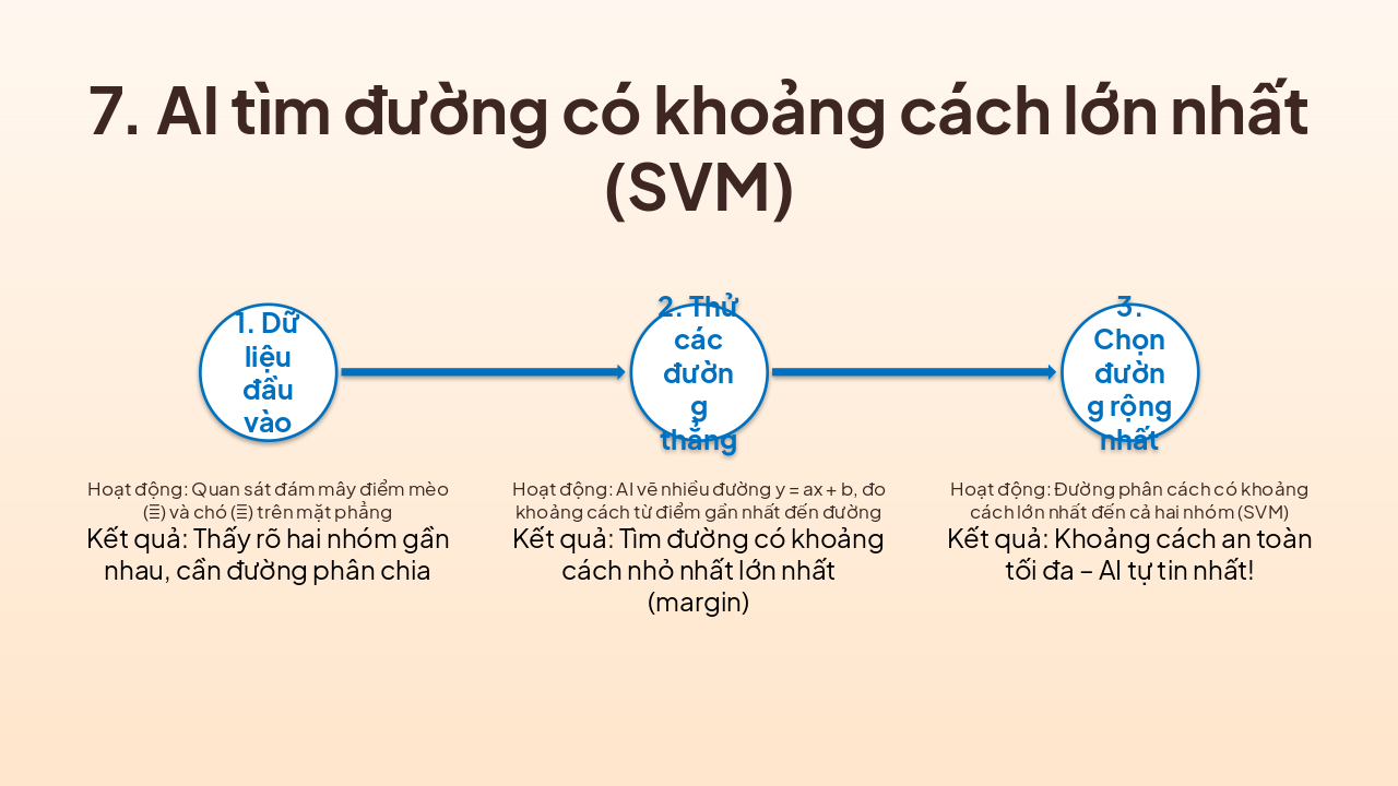 { "headers": [ "Bước", "Hoạt động", "Kết quả" ], "rows": [ [ "1. Dữ liệu đầu vào", "Quan sát đám mây điểm mèo (🔵) và chó (🔴) trên mặt phẳng", "Thấy rõ hai nhóm gần nhau, cần đường phân chia" ], [ "2. Thử các đường thẳng", "AI vẽ nhiều đường y = ax + b, đo khoảng cách từ điểm gần nhất đến đường", "Tìm đường có khoảng cách nhỏ nhất lớn nhất (margin)" ], [ "3. Chọn đường rộng nhất", "Đường phân cách có khoảng cách lớn nhất đến cả hai nhóm (SVM)", "Khoảng cách an toàn tối đa – AI tự tin nhất!" ] ] }