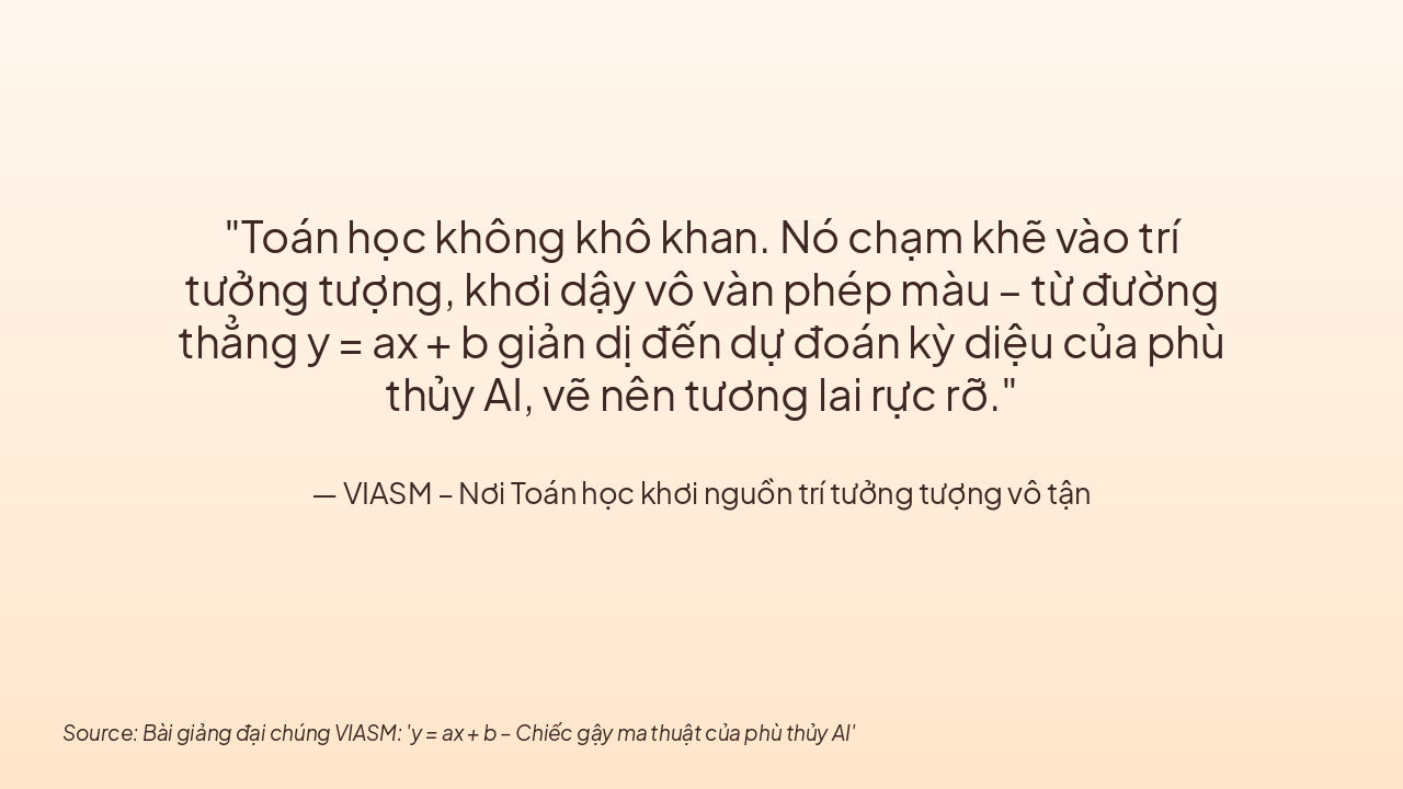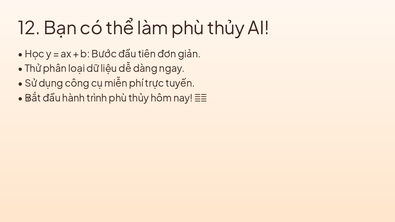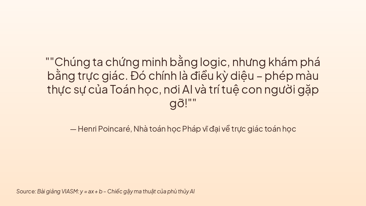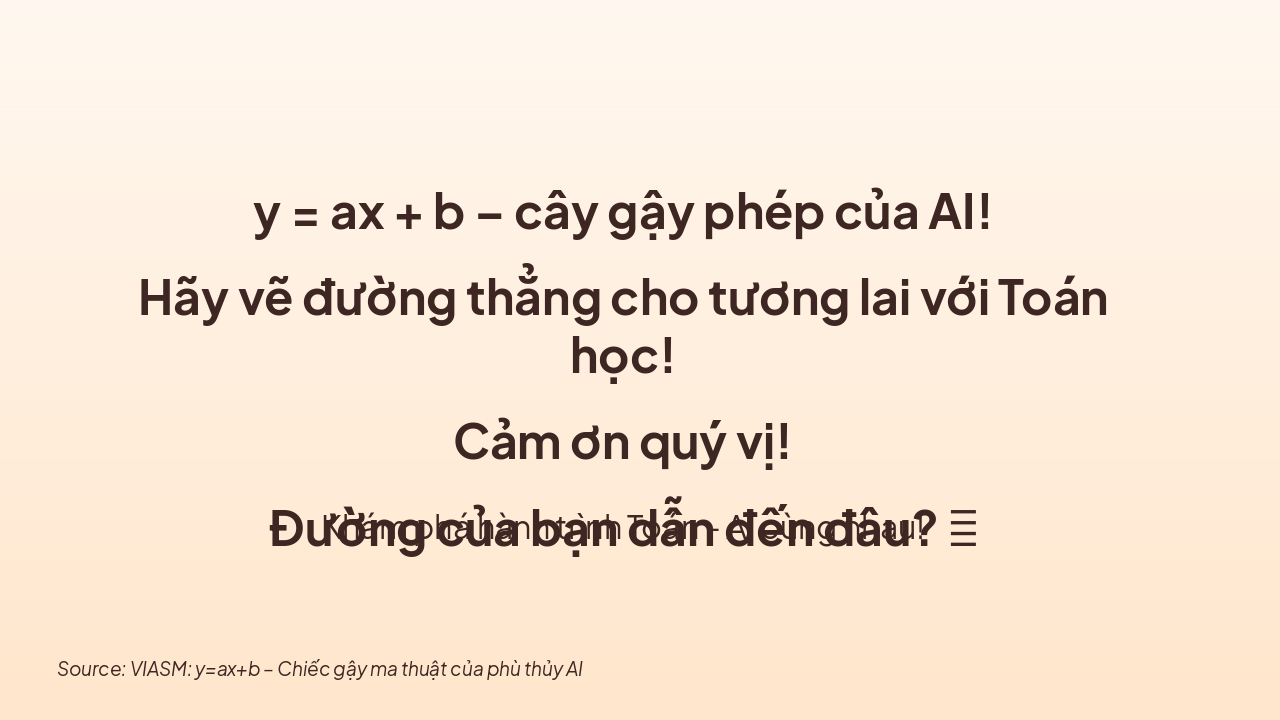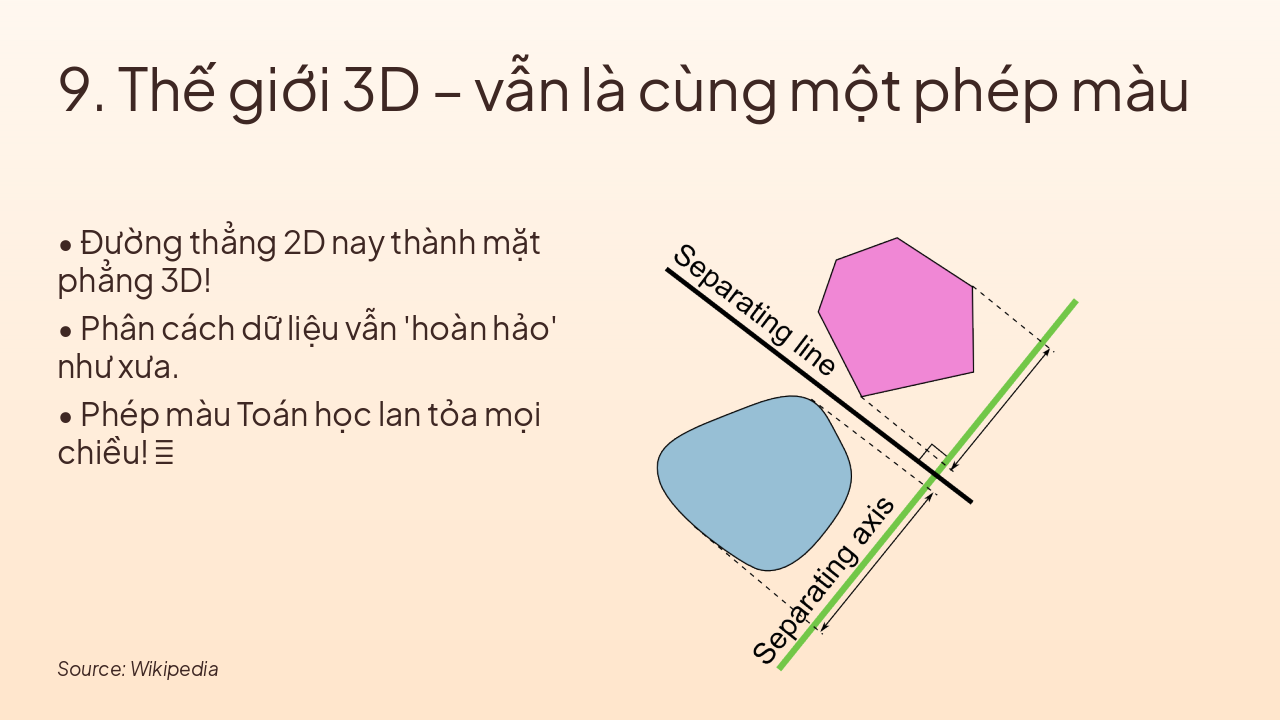 { "headers": [ "Bước", "Hoạt động", "Kết quả" ], "rows": [ [ "1. Dữ liệu đầu vào", "Quan sát đám mây điểm mèo (🔵) và chó (🔴) trên mặt phẳng", "Thấy rõ hai nhóm gần nhau, cần đường phân chia" ], [ "2. Thử các đường thẳng", "AI vẽ nhiều đường y = ax + b, đo khoảng cách từ điểm gần nhất đến đường", "Tìm đường có khoảng cách nhỏ nhất lớn nhất (margin)" ], [ "3. Chọn đường rộng nhất", "Đường phân cách có khoảng cách lớn nhất đến cả hai nhóm (SVM)", "Khoảng cách an toàn tối đa – AI tự tin nhất!" ] ] }