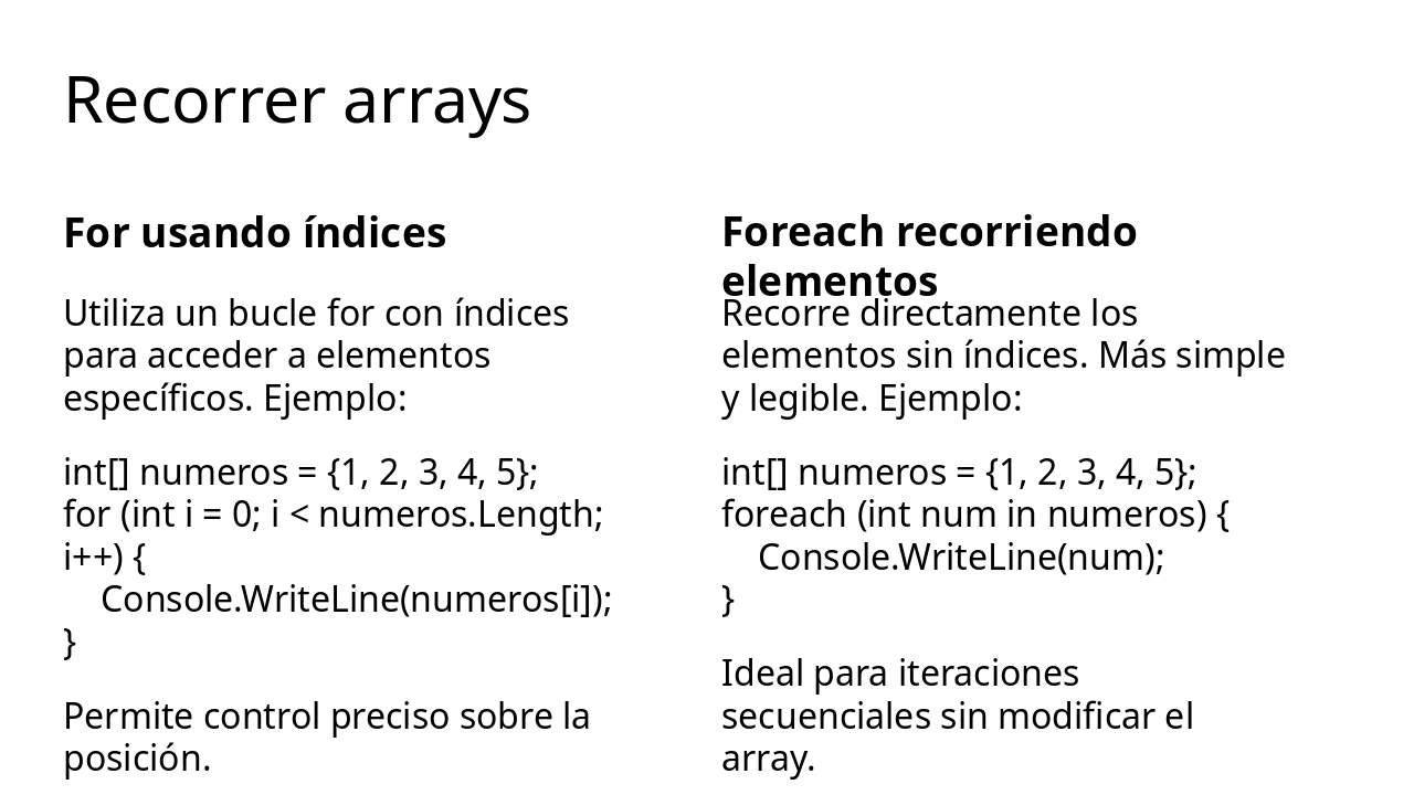 The slide "Recorrer arrays" compares two methods for iterating over arrays in C#. The left column explains using a for loop with indices for precise positional control, as shown in an example that prints array elements from index 0 to Length-1. The right column describes the foreach loop for directly accessing elements sequentially without indices, highlighting its simplicity and suitability for read-only traversals.