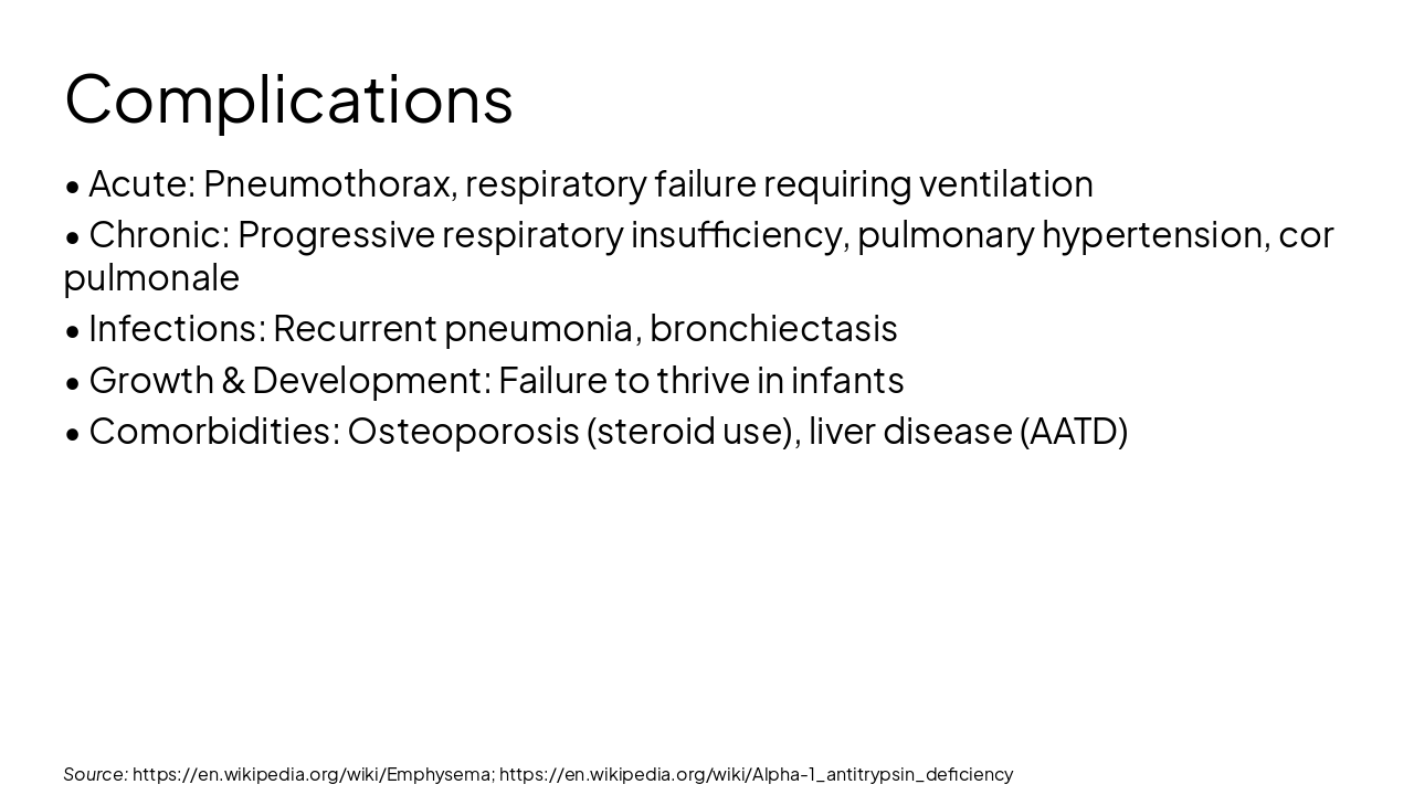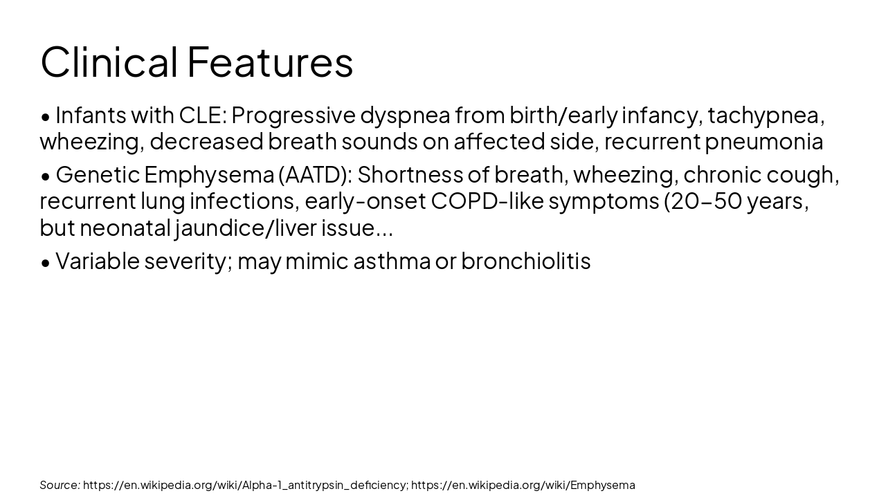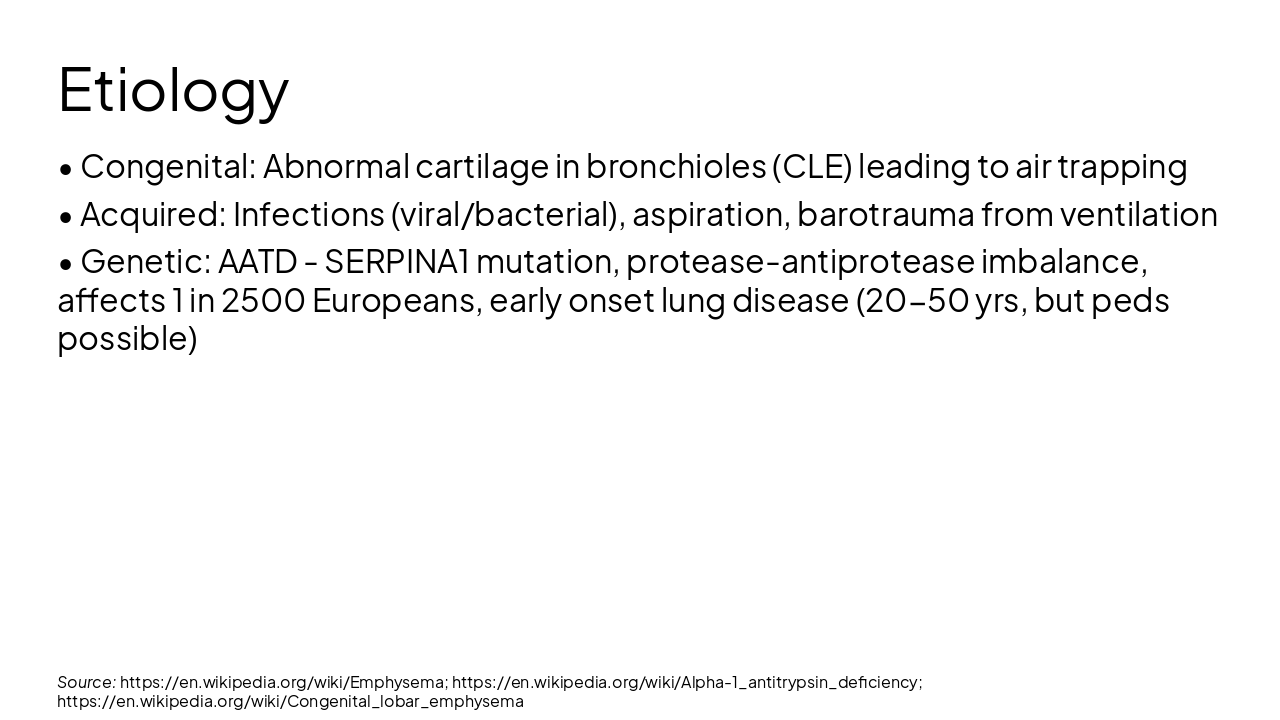 Source: https://en.wikipedia.org/wiki/Emphysema; https://en.wikipedia.org/wiki/Alpha-1_antitrypsin_deficiency; https://en.wikipedia.org/wiki/Congenital_lobar_emphysema