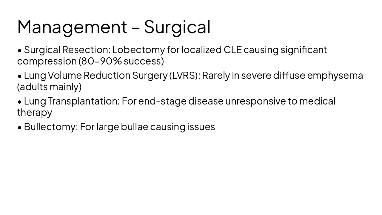 Key Takeaways: Early diagnosis and management crucial for pediatric emphysema Tailor approach to etiology (CLE vs AATD) Multidisciplinary care improves outcomes