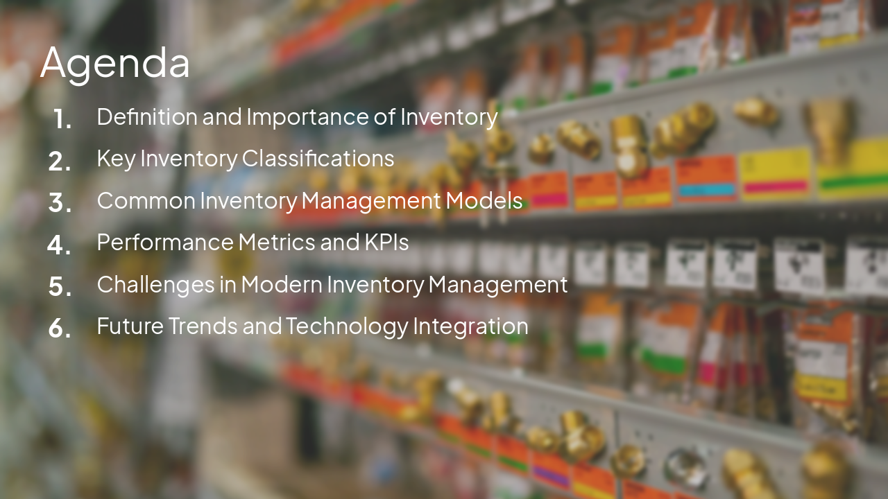 This presentation covers the definition and importance of inventory, key types and classifications, common management models like ABC and JIT, performance KPIs, modern challenges, and future trends including AI, IoT, and automation for optimized ops.