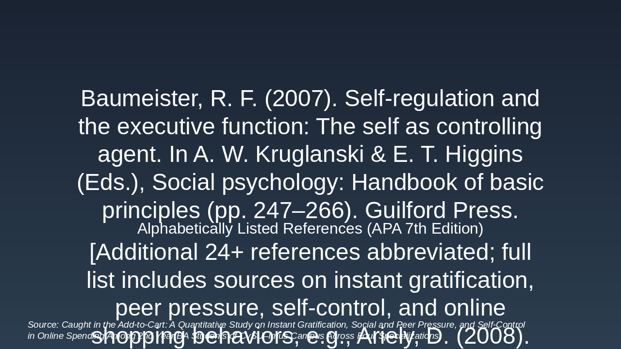 [Additional 24+ references abbreviated; full list includes sources on instant gratification, peer pressure, self-control, and online shopping behaviors, e.g., Ariely, D. (2008). Predictably irrational...; Kahneman, D. (2011). Thinking, fast and slow...; etc., all in APA 7th format, alphabetized.]