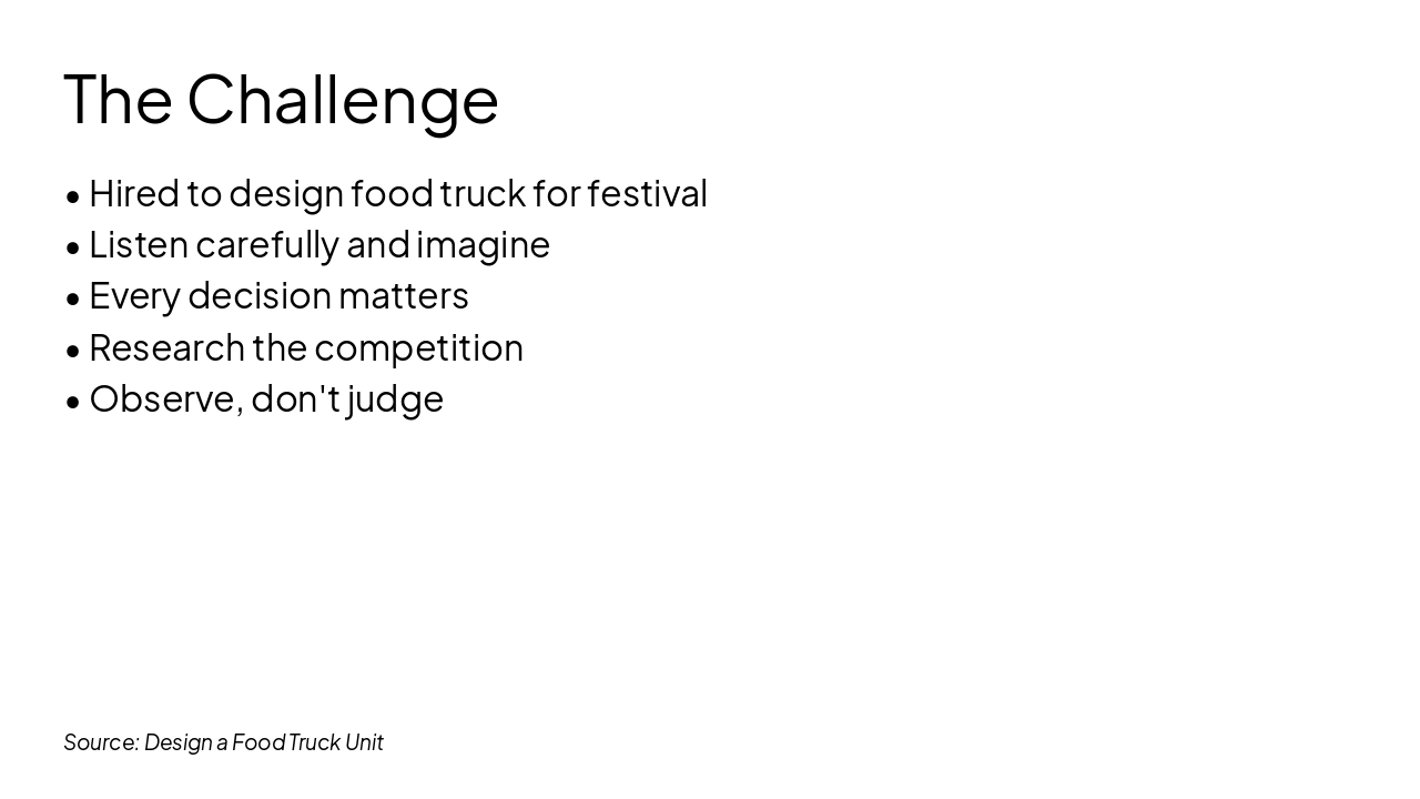 This title slide is titled "Design a Food Truck" and features the subtitle "Think Like Entrepreneurs & Designers." It introduces a session focused on designing a food truck by adopting an entrepreneurial and design-oriented mindset.