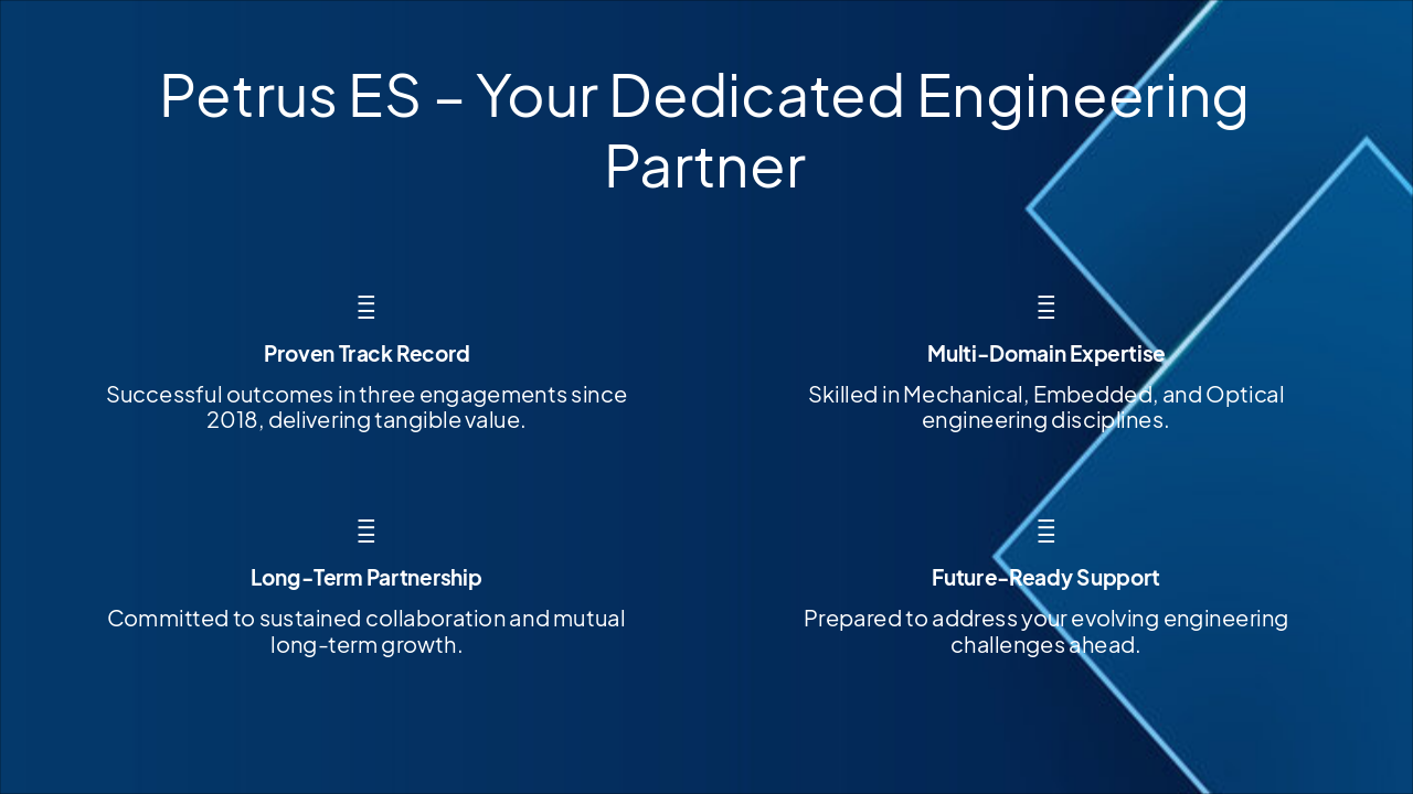 The slide "Petrus ES – Your Dedicated Engineering Partner" presents a feature grid highlighting four key strengths. It emphasizes a proven track record in three engagements since 2018, multi-domain expertise in mechanical, embedded, and optical engineering, long-term partnership commitment, and future-ready support for evolving challenges.