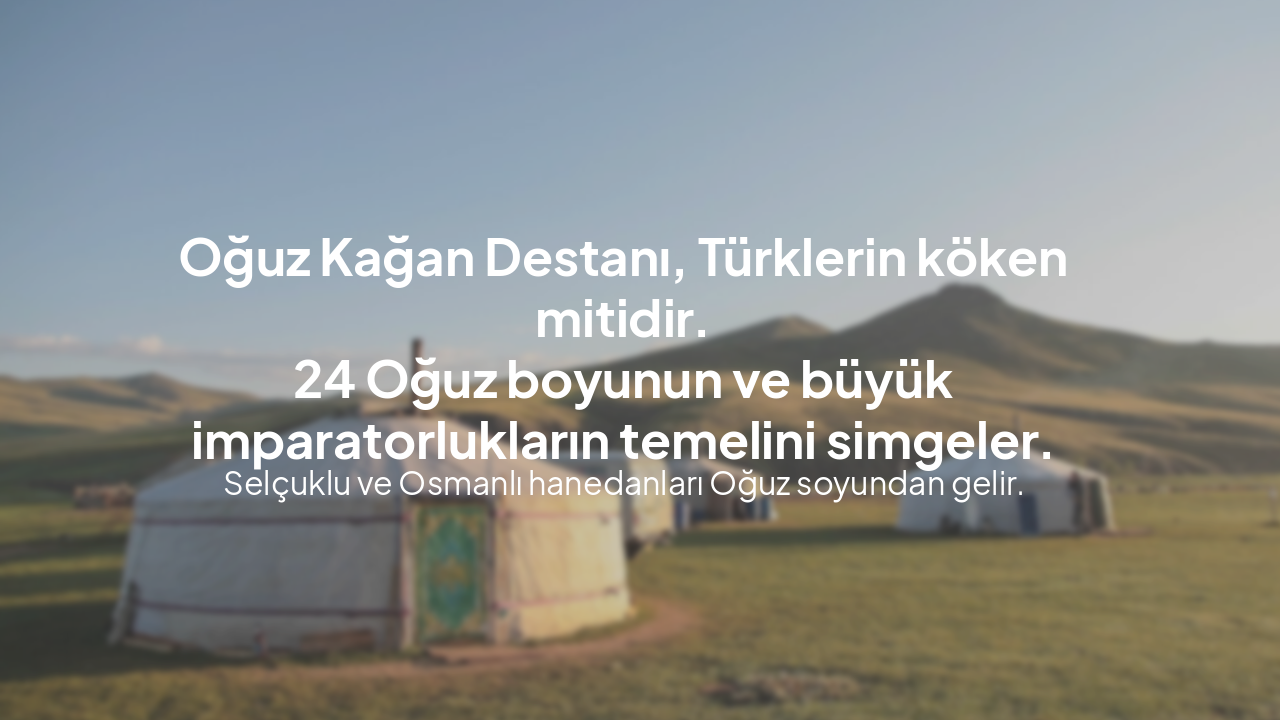 Oğuz Kağan Destanı, Türk mitolojisinin merkezinde yer alan efsanedir. Oğuz'un doğumu, bozkurt rehberliği, mucizeleri, fetihleri, Gök Kız'la evliliği, 6 oğlu ve 24 Oğuz boyunun oluşumu ile Türk halklarının kökeni bu sunumda ele alınır. Selçuklu ve Осm