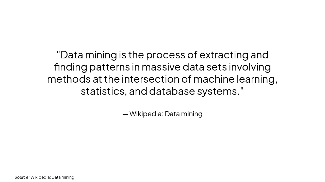 > Data mining is the process of extracting and finding patterns in massive data sets involving methods at the intersection of machine learning, statistics, and database systems.