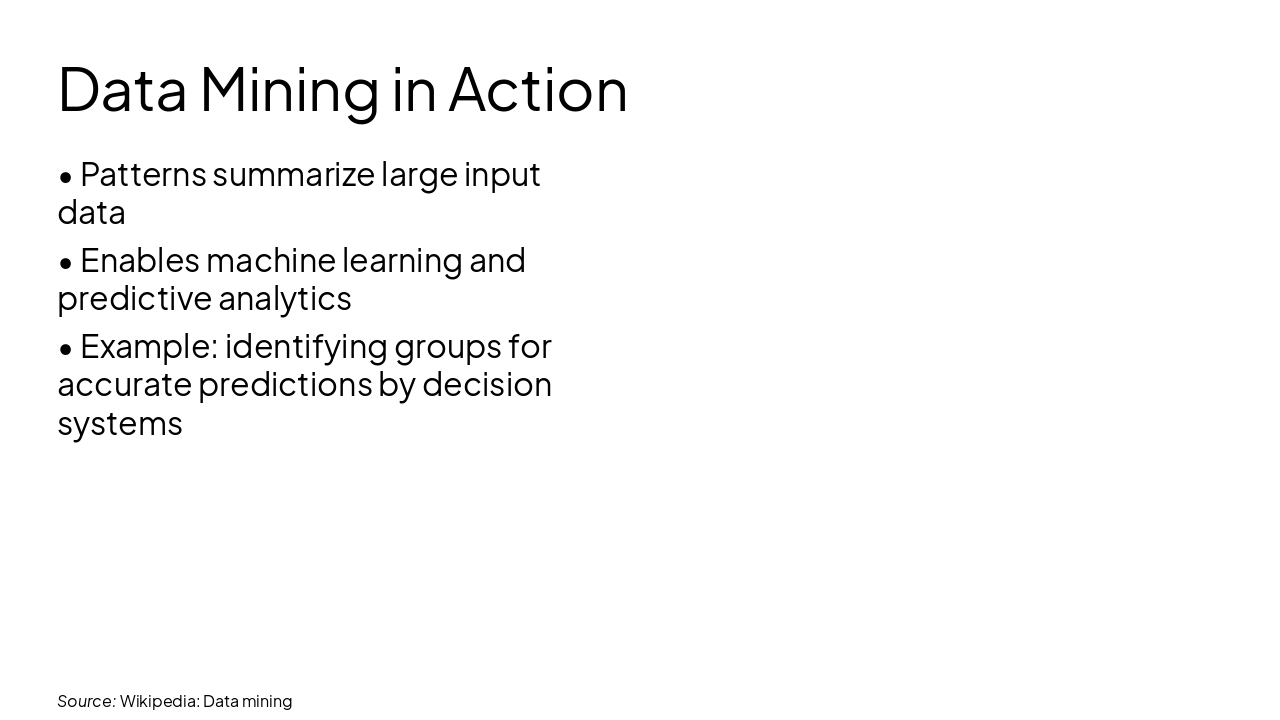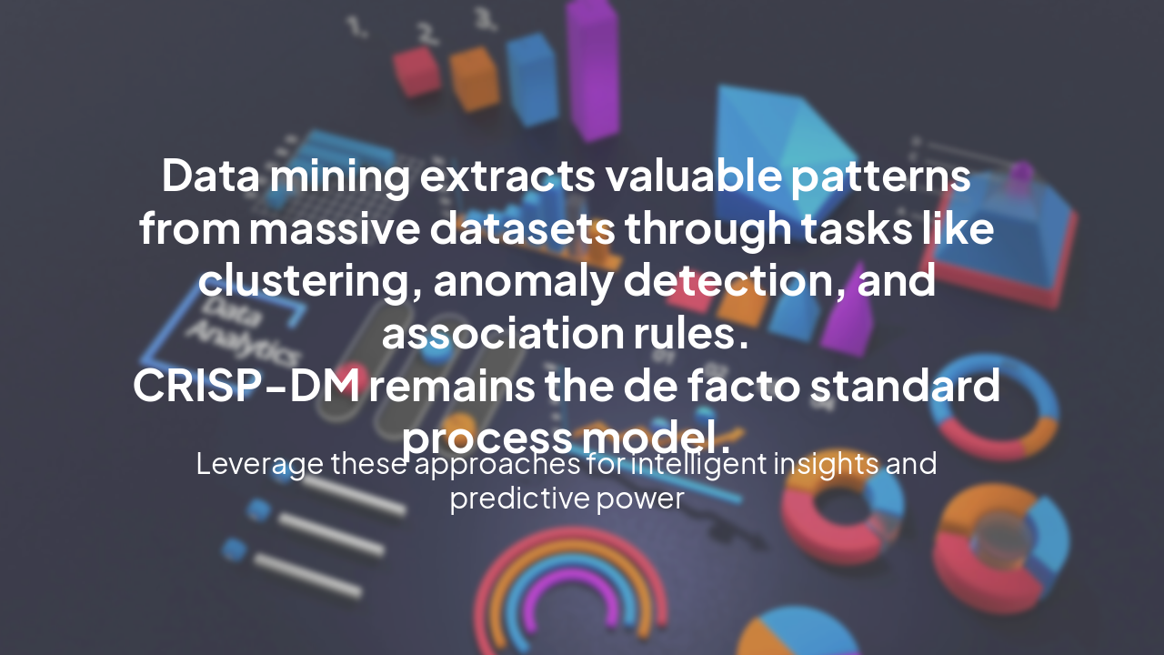 Explore data mining fundamentals: definitions, key tasks like clustering, anomaly detection, and association rules; the CRISP-DM process model; and other methodologies for extracting insights from massive datasets.