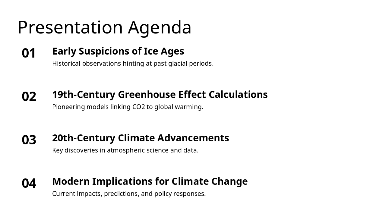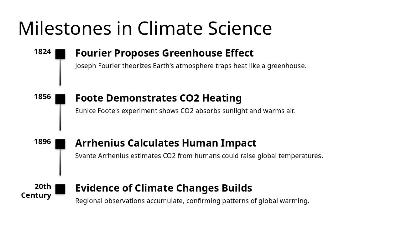 The slide is titled "The History of Climate Change Science" and serves as an introductory title slide. Its subtitle highlights key scientific discoveries in the field starting from the 19th century onward.