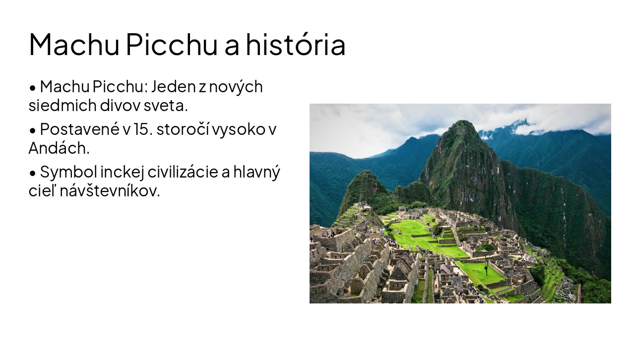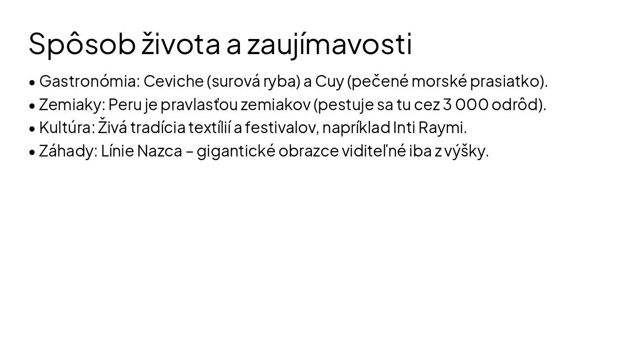 🇵🇪 Peru: Krajina Inkov a kontrastov Peru je tretí najväčší štát Južnej Ameriky, známy svojou neuveriteľnou biodiverzitou a bohatou históriou. 📈 Hospodárstvo a údaje (2026) • HDP: Odhadovaný rast pre rok 2026 je 2,9 %. Ekonomika je stabilná, poháňaná najmä exportom a súkromnou spotrebou. • Hlavné odvetvia: Ťažba nerastných surovín (meď, zlato, zinok), poľnohospodárstvo a turizmus. • Mena: Peruánsky sol (PEN). Aktuálny kurz sa pohybuje okolo 3,30 PEN za 1 USD. • Obyvateľstvo: Približne 56 % ľudí žije vo veľkých mestách, 27 % na vidieku. 🏔️ Príroda a pohorie Andy Peru sa delí na tri hlavné oblasti: Costa (pobrežie), Sierra (hory) a Selva (džungľa). • Pohorie Andy: Dominuje vnútrozemiu. Najvyšší vrch je Huascarán (6 768 m n. m.). • Amazonský prales: Pokrýva viac ako 60 % územia Peru. Krajina patrí medzi megadiverzné štáty (cez 25 000 druhov rastlín a 1 900 druhov vtákov). • Jazero Titicaca: Najvyššie položené splavné jazero na svete (3 812 m n. m.). 🏙️ Mestá a dediny • Lima: Hlavné mesto a "Mesto kráľov". Má takmer 10 miliónov obyvateľov a je kulinárskym centrom sveta. • Cusco: Bývalé hlavné mesto ríše Inkov, zapísané v UNESCO. • Arequipa: Známa ako "Biele mesto" kvôli stavbám z bieleho sopečného kameňa. • Dediny: V Andách si zachovávajú tradičný ráz. Obyvatelia sa venujú chovu lám, alpák a pestovaniu plodín na terasovitých políčkach. 🍎 Spôsob života a zaujímavosti • Gastronómia: Národným jedlom je Ceviche (surová ryba v citruse) a špecialitou je Cuy (pečené morské prasiatko). • Zemiaky: Peru je pravlasťou zemiakov, pestuje sa tu viac ako 3 000 odrôd. • Kultúra: Živá tradícia textílií a festivalov (napr. Inti Raymi – slávnosť Slnka). • Záhady: Línie Nazca – obrovské obrazce v púšti viditeľné len z lietadla. • Machu Picchu: Jeden z nových siedmich divov sveta, postavený v 15. storočí. A nech je to aspoň 10 slidov