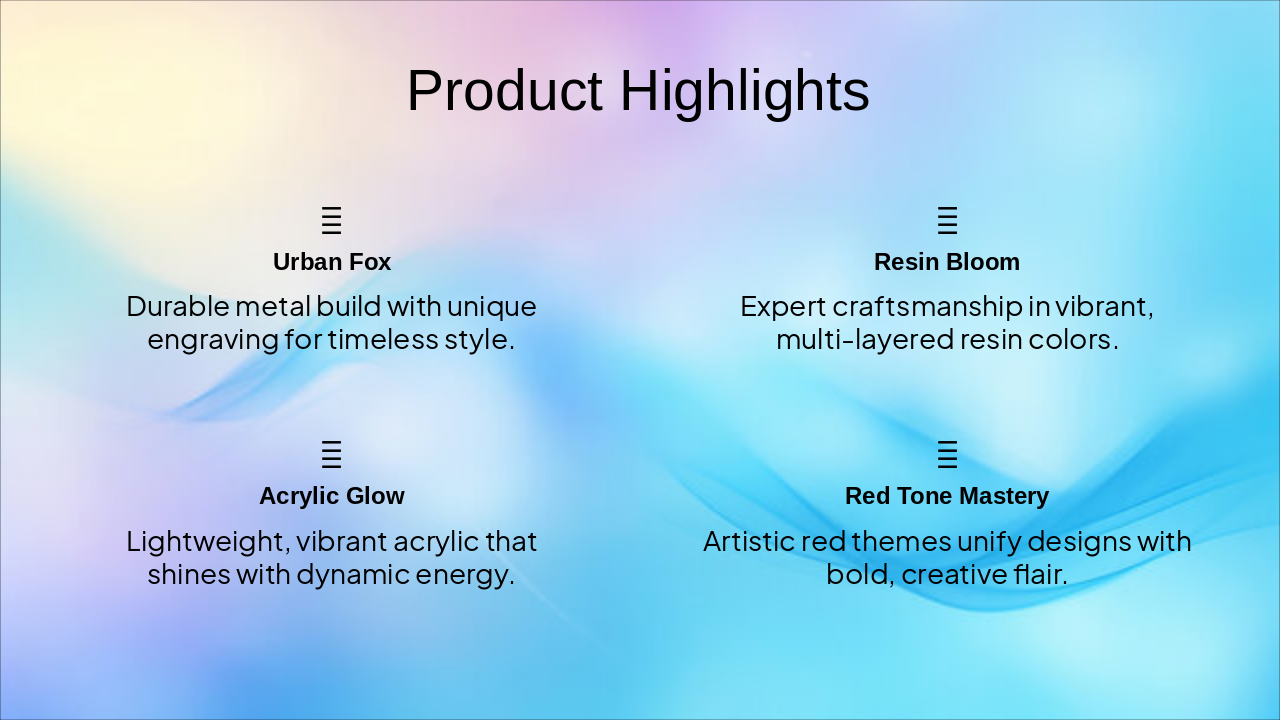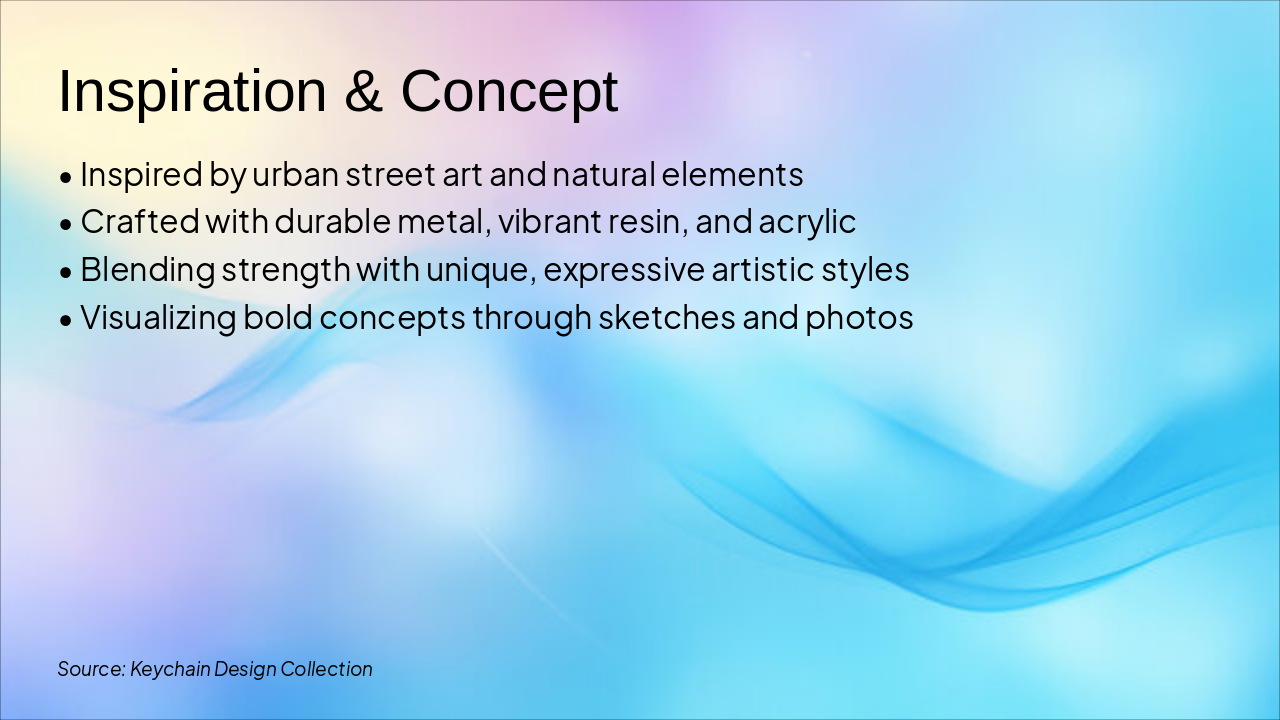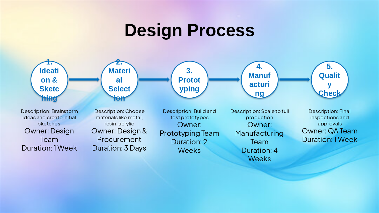 { "headers": [ "Phase", "Description", "Owner", "Duration" ], "rows": [ [ "1. Ideation & Sketching", "Brainstorm ideas and create initial sketches", "Design Team", "1 Week" ], [ "2. Material Selection", "Choose materials like metal, resin, acrylic", "Design & Procurement", "3 Days" ], [ "3. Prototyping", "Build and test prototypes", "Prototyping Team", "2 Weeks" ], [ "4. Manufacturing", "Scale to full production", "Manufacturing Team", "4 Weeks" ], [ "5. Quality Check", "Final inspections and approvals", "QA Team", "1 Week" ] ] }