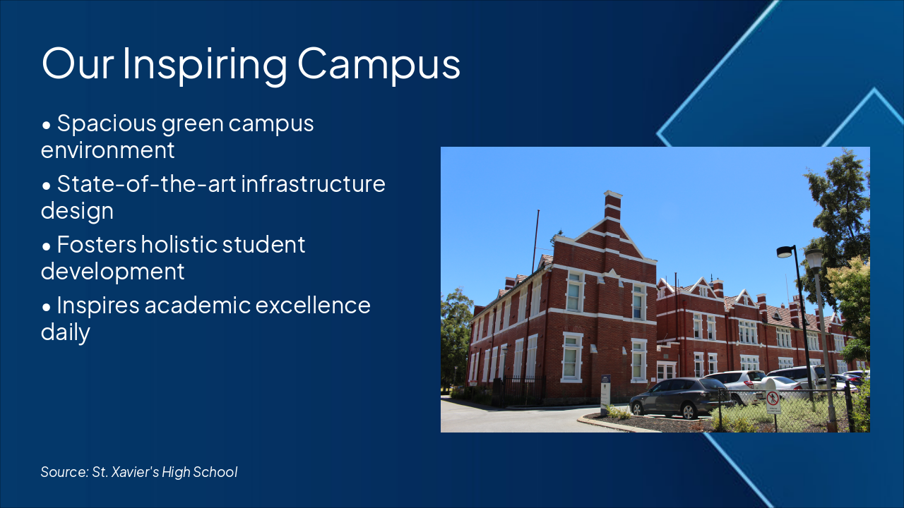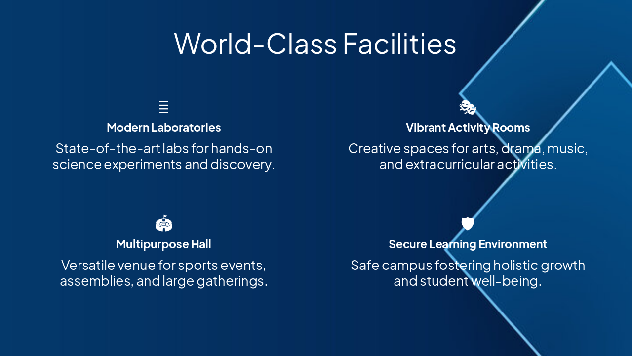 The "World-Class Facilities" slide highlights modern laboratories for hands-on science, vibrant activity rooms for arts and extracurriculars, a multipurpose hall for sports and events, and a secure campus environment. These features foster discovery, creativity, versatility, and holistic student well-being.