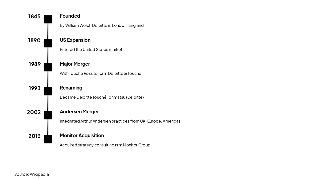 1845: Founded By William Welch Deloitte in London, England 1890: US Expansion Entered the United States market 1989: Major Merger With Touche Ross to form Deloitte & Touche 1993: Renaming Became Deloitte Touché Tohmatsu (Deloitte) 2002: Andersen Merger Integrated Arthur Andersen practices from UK, Europe, Americas 2013: Monitor Acquisition Acquired strategy consulting firm Monitor Group