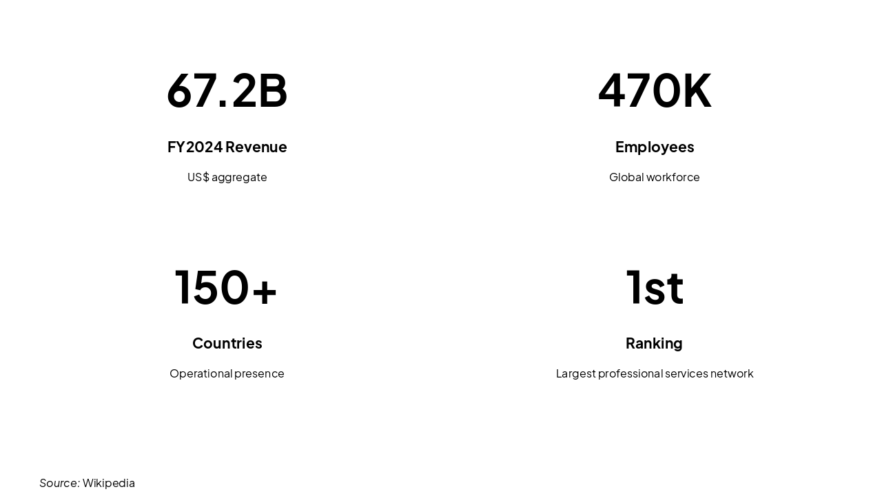 Founded 1845 | Big Four | 470K employees | $67.2B revenue FY2024