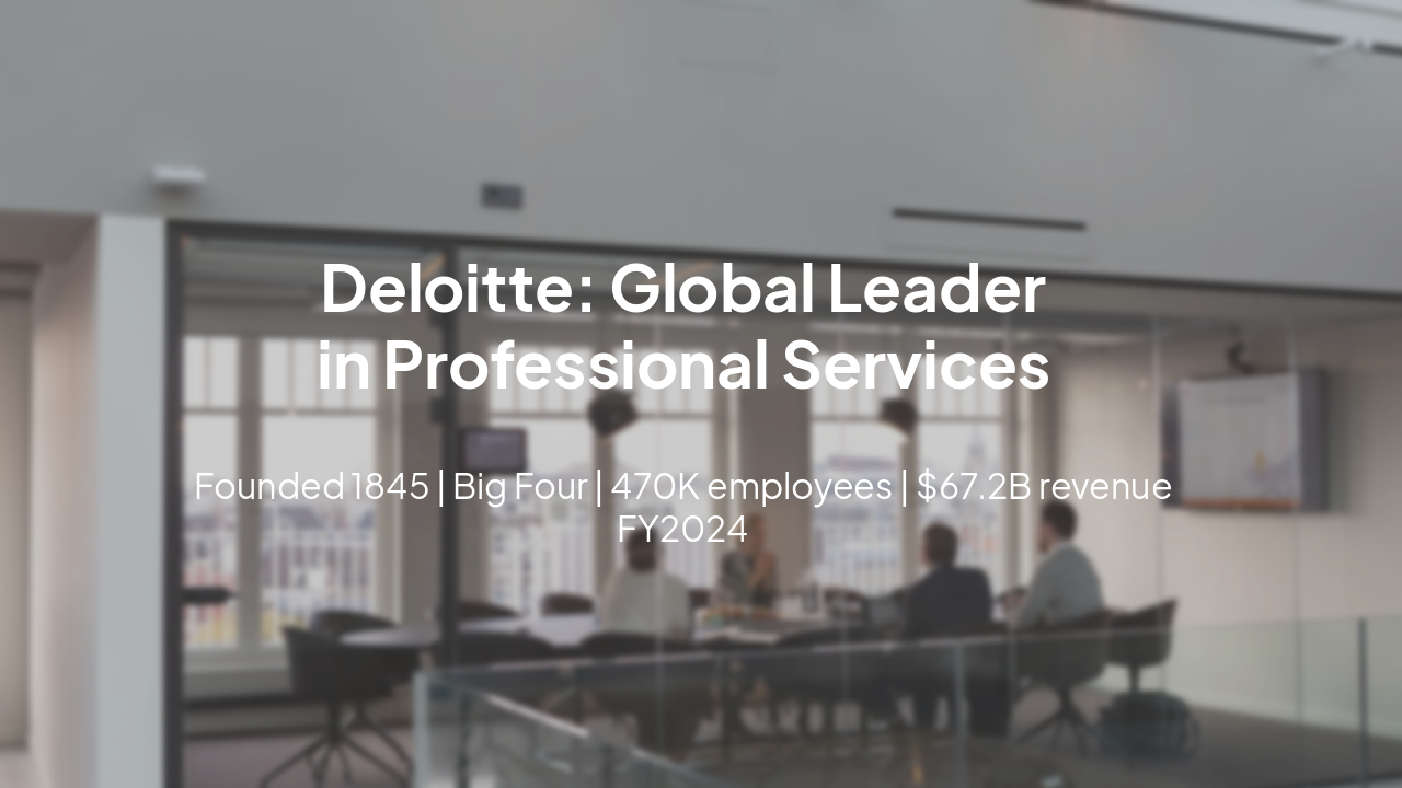 Overview of Deloitte, the world's largest professional services network. Covers company history from 1845, global scale (470K employees, $67.2B FY2024 revenue, 150+ countries), core services (audit, consulting, financial advisory, risk, tax, legal),认