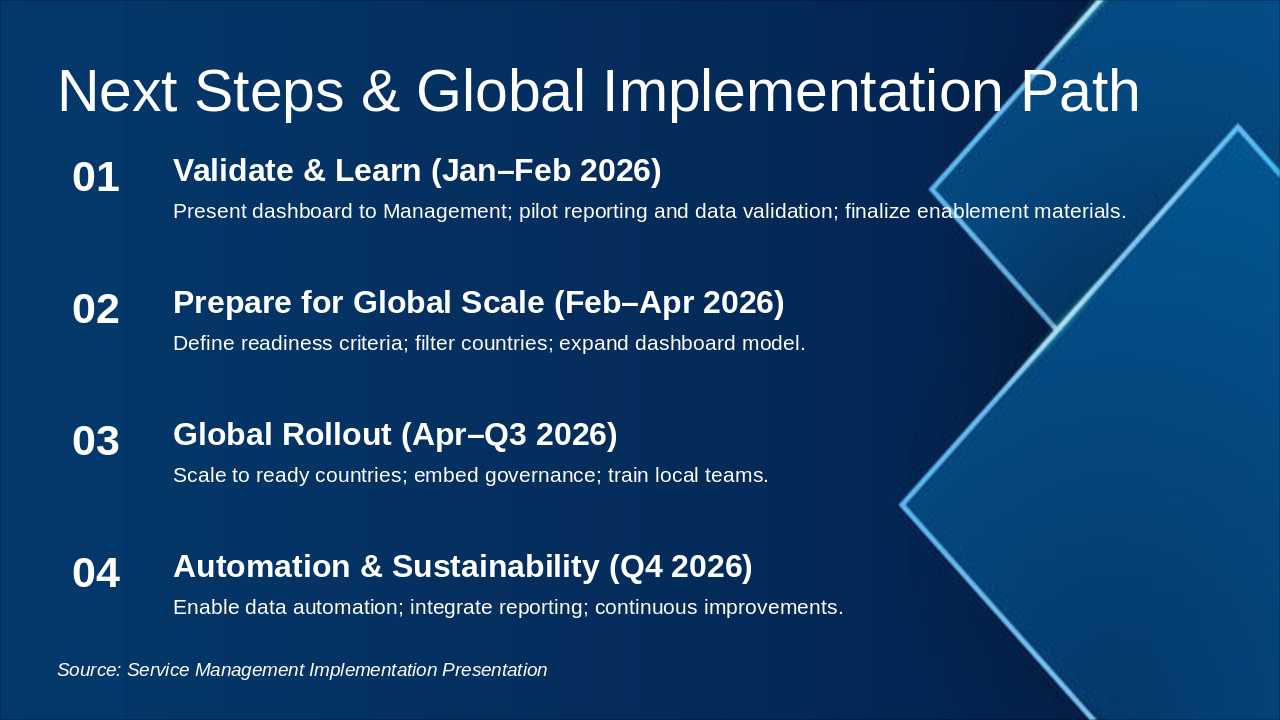 The slide highlights key accomplishments in Service Management Implementation, such as defined frameworks, selected pilots with KPIs/KRIs, a car-dashboard concept, incident tracking readiness, and aligned governance. It outlines the pilot timeline—final KPI alignment by December 2025 and full operation by end of January 2026—to establish a foundation for testing, validation, and global scalability.