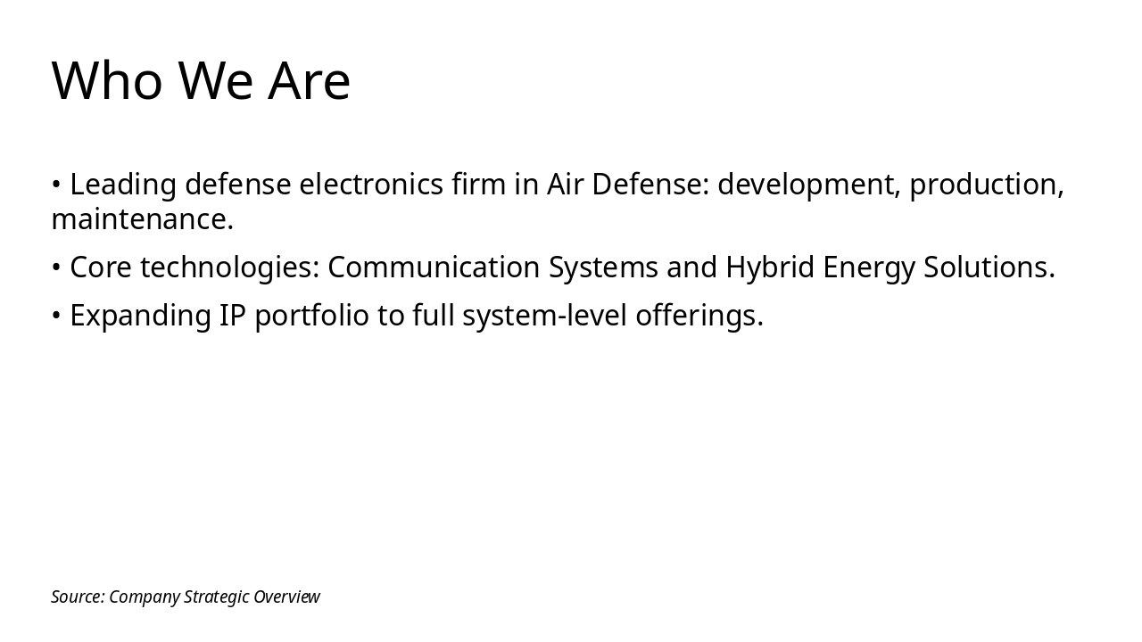 The slide, titled "Who We Are & Strategic Vision," serves as an introductory title slide. Its subtitle highlights the company's role in leading the future of defense electronics, with a focus on air defense and communications.