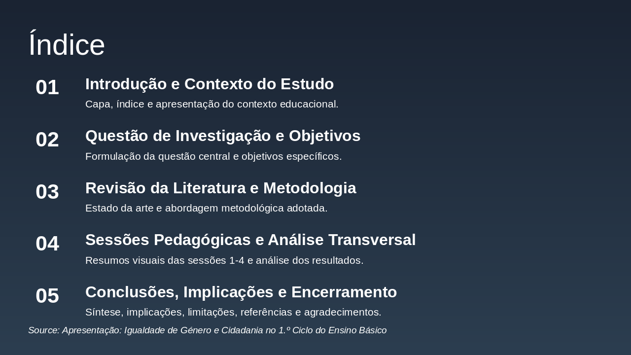 Slide de índice resumindo a estrutura principal da apresentação em 5 seções chave.