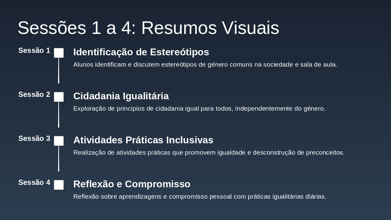 Resumos visuais das sessões 1-4 e análise dos resultados.
