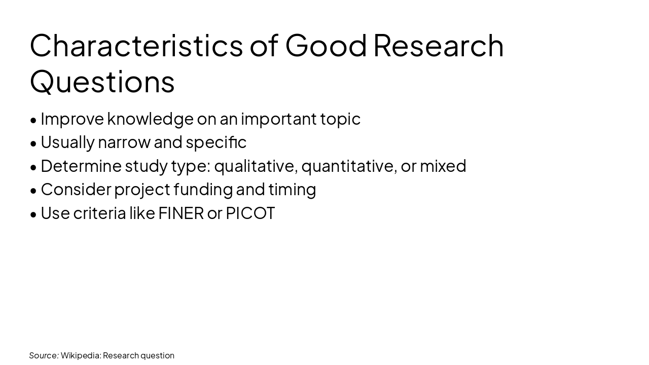 - Use criteria like FINER or PICOT