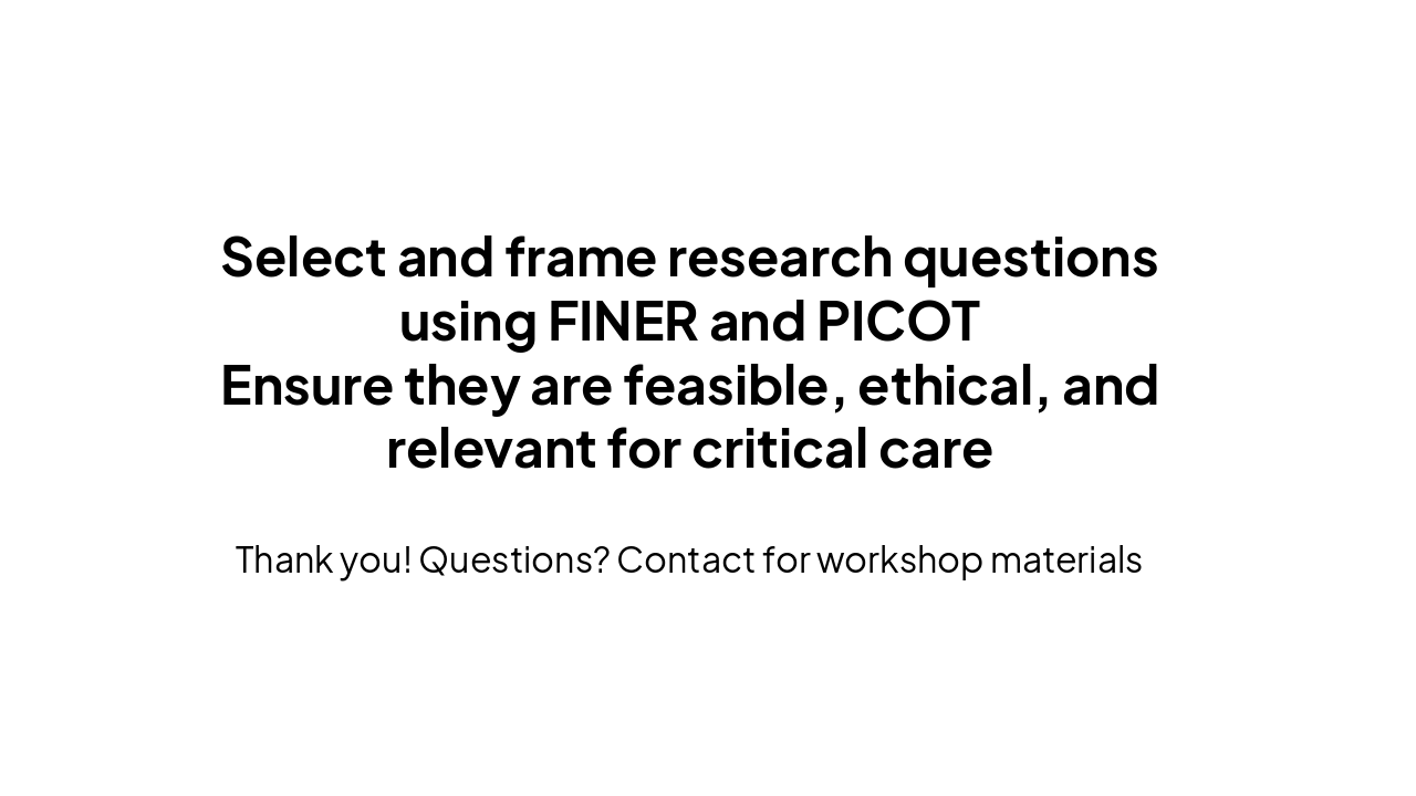 20-min Critical Care Workshop on selecting and framing research questions using FINER criteria (Feasible, Interesting, Novel, Ethical, Relevant) and PICOT framework (Population, Intervention, Comparison, Outcome, Time). Covers ICU overview, practical