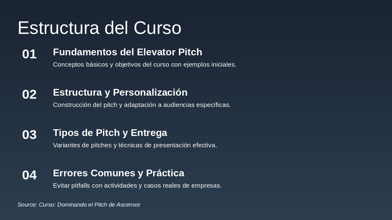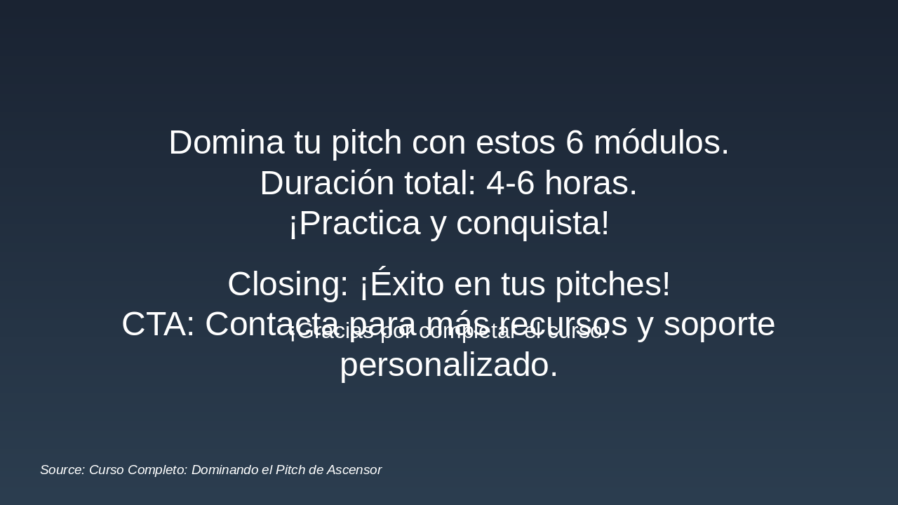 Curso completo de 6 módulos para crear y presentar pitches profesionales en 4-6 horas
