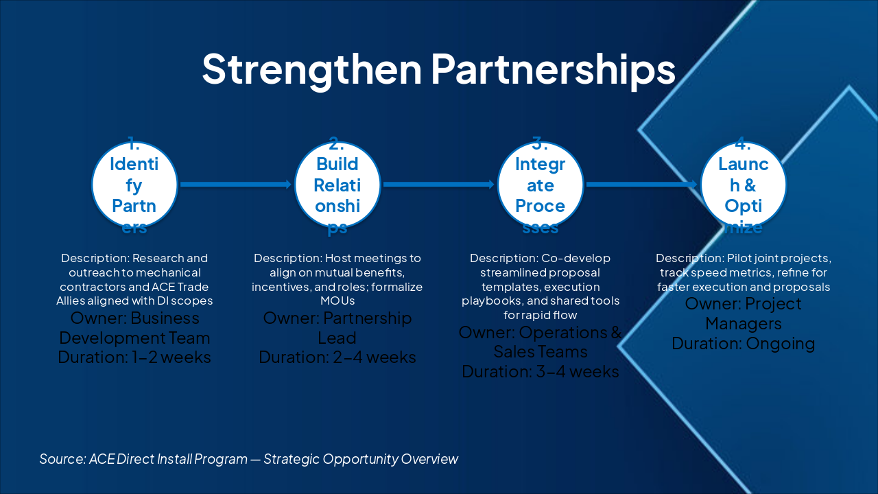 The "Strengthen Partnerships" workflow outlines four steps to collaborate with mechanical contractors and ACE Trade Allies: identify partners via research and outreach (Business Development Team, 1-2 weeks). Build relationships through meetings and MOUs, integrate processes with shared tools (Operations & Sales Teams, 2-4 weeks total), and launch pilots for ongoing optimization (Project Managers).
