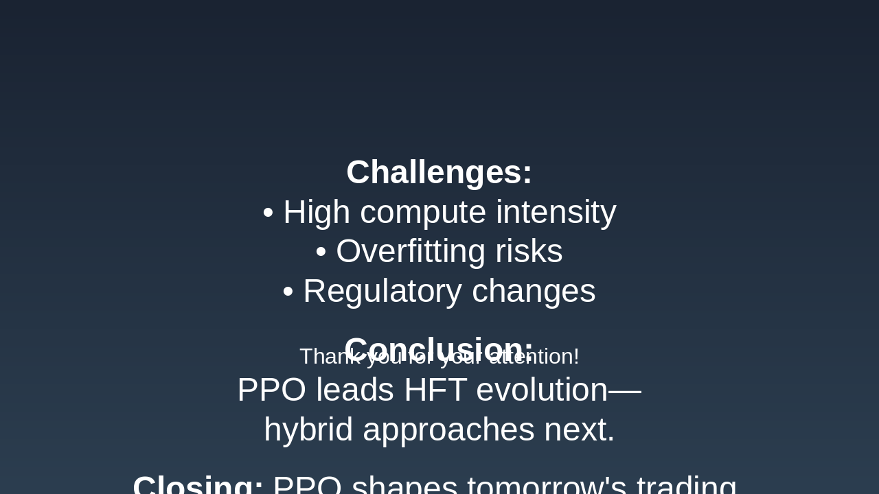 The slide outlines key challenges like high compute intensity, overfitting risks, and regulatory changes, while concluding that PPO leads HFT evolution with hybrid approaches next. It closes by noting PPO shapes tomorrow's trading, provides contact for the full study and collaboration, and thanks the audience.