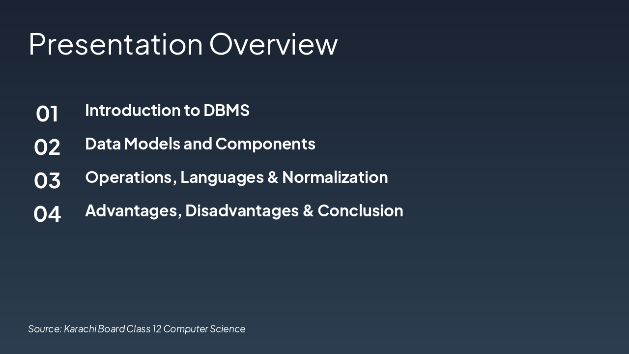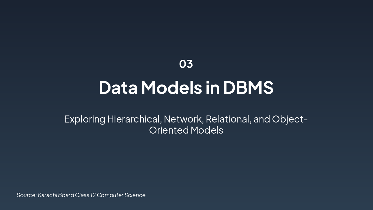 This title slide introduces "Database Management System (DBMS)" as the main topic. It features a subtitle on exploring concepts, types, and applications for Karachi Board Class 12 Computer Science.