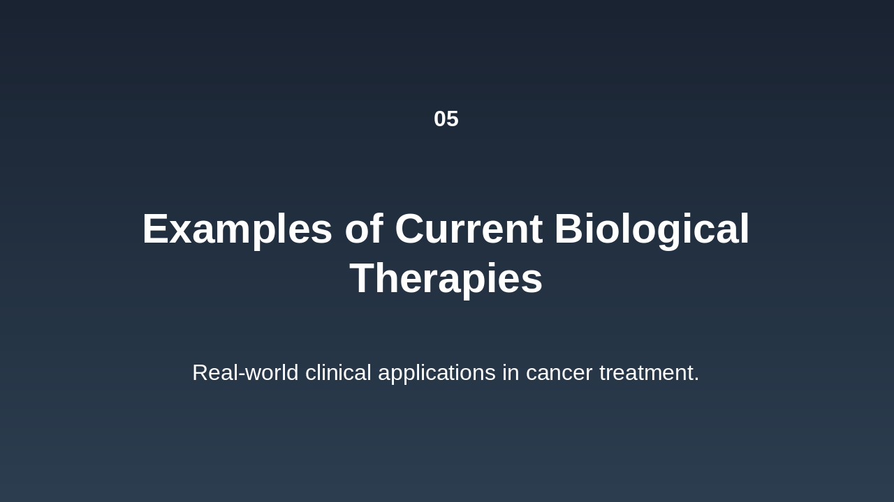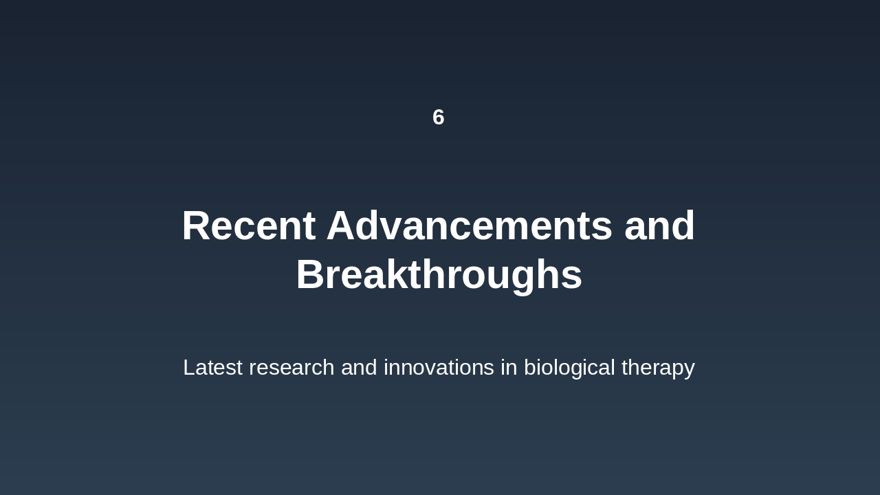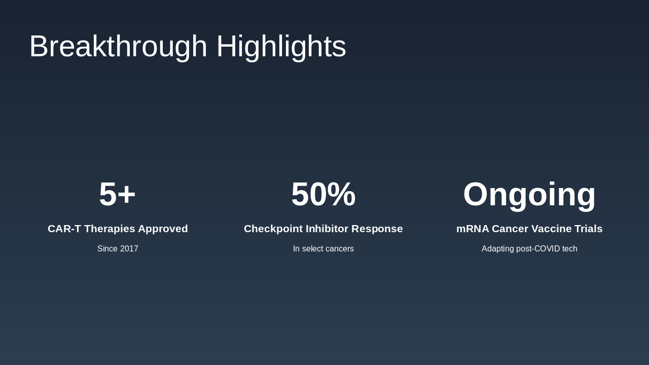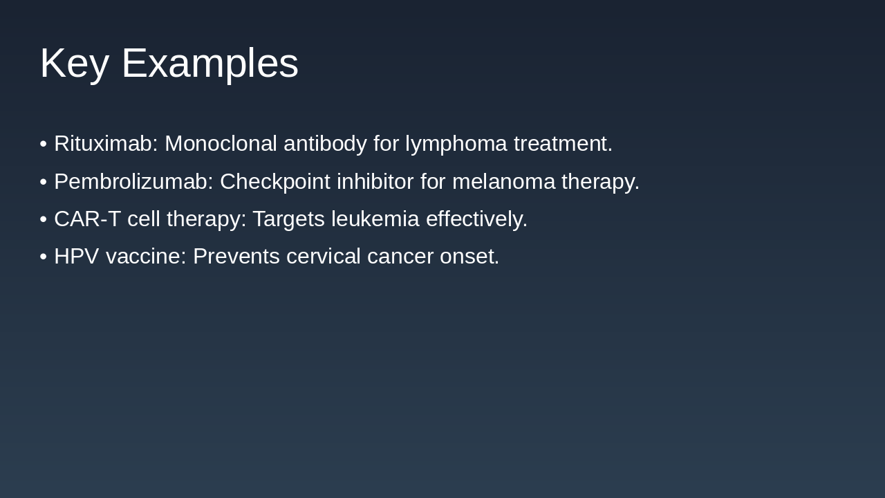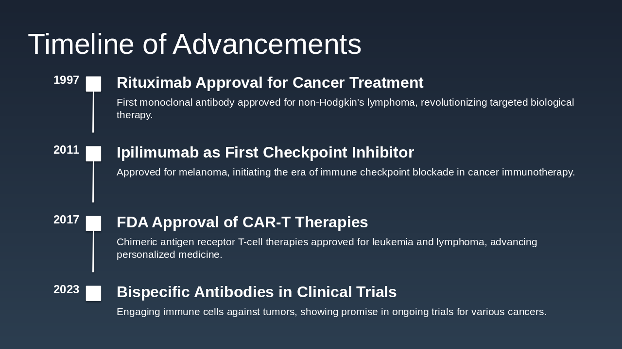 1997: Rituximab Approval for Cancer Treatment First monoclonal antibody approved for non-Hodgkin's lymphoma, revolutionizing targeted biological therapy. 2011: Ipilimumab as First Checkpoint Inhibitor Approved for melanoma, initiating the era of immune checkpoint blockade in cancer immunotherapy. 2017: FDA Approval of CAR-T Therapies Chimeric antigen receptor T-cell therapies approved for leukemia and lymphoma, advancing personalized medicine. 2023: Bispecific Antibodies in Clinical Trials Engaging immune cells against tumors, showing promise in ongoing trials for various cancers.
