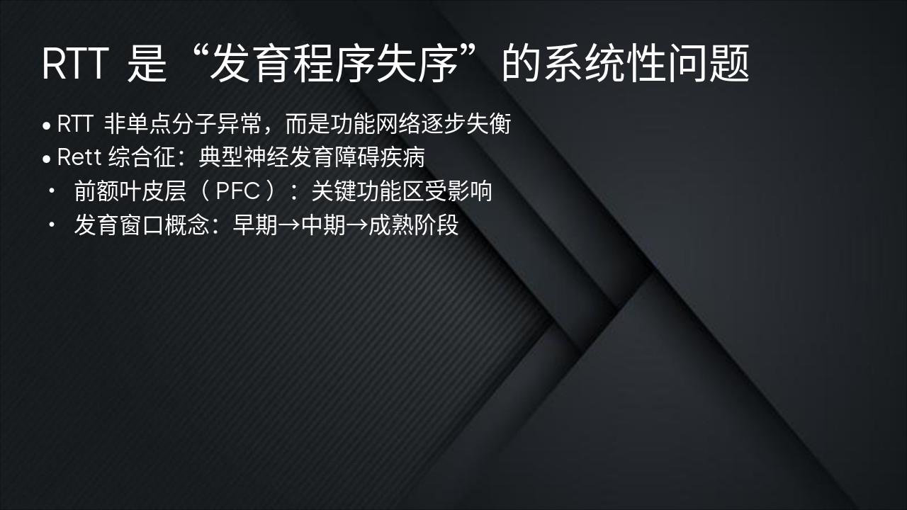 RTT 被视为“发育程序失序”的系统性问题。副标题强调从基因异常到发育程序失序的系统性视角。