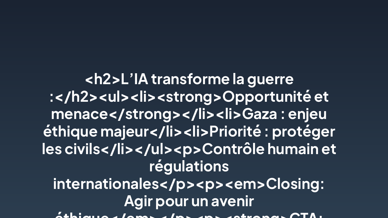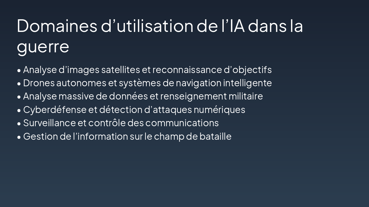 Ce diaporama intitulé « IA dans les Conflits Armés » explore l'usage de l'intelligence artificielle dans les conflits armés, en mettant l'accent sur les enjeux, exemples et questions éthiques. Le sous-titre souligne les avantages stratégiques et les défis éthiques en guerre moderne.