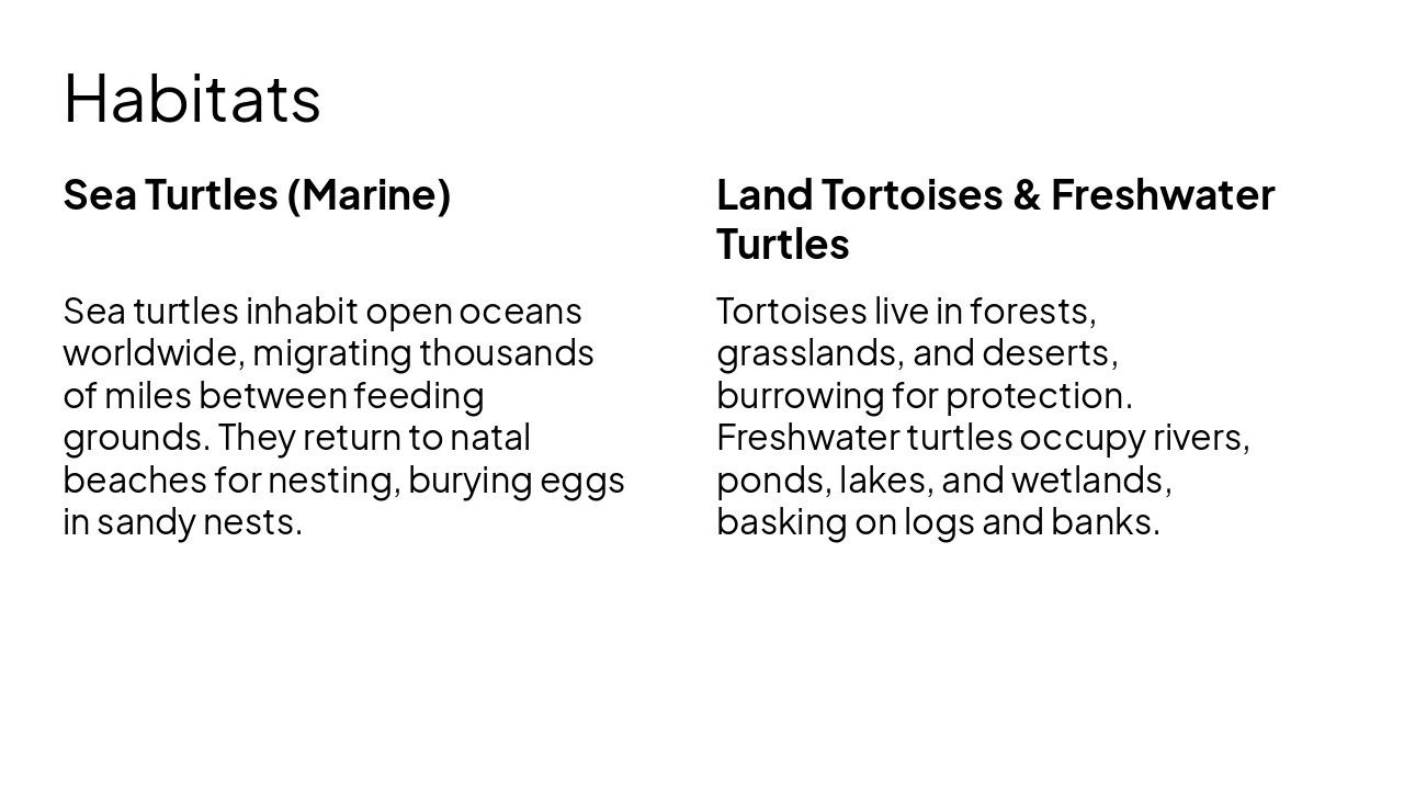 | Sea turtles inhabit open oceans worldwide, migrating thousands of miles between feeding grounds. They return to natal beaches for nesting, burying eggs in sandy nests. | Tortoises live in forests, grasslands, and deserts, burrowing for protection. Freshwater turtles occupy rivers, ponds, lakes, and wetlands, basking on logs and banks. |