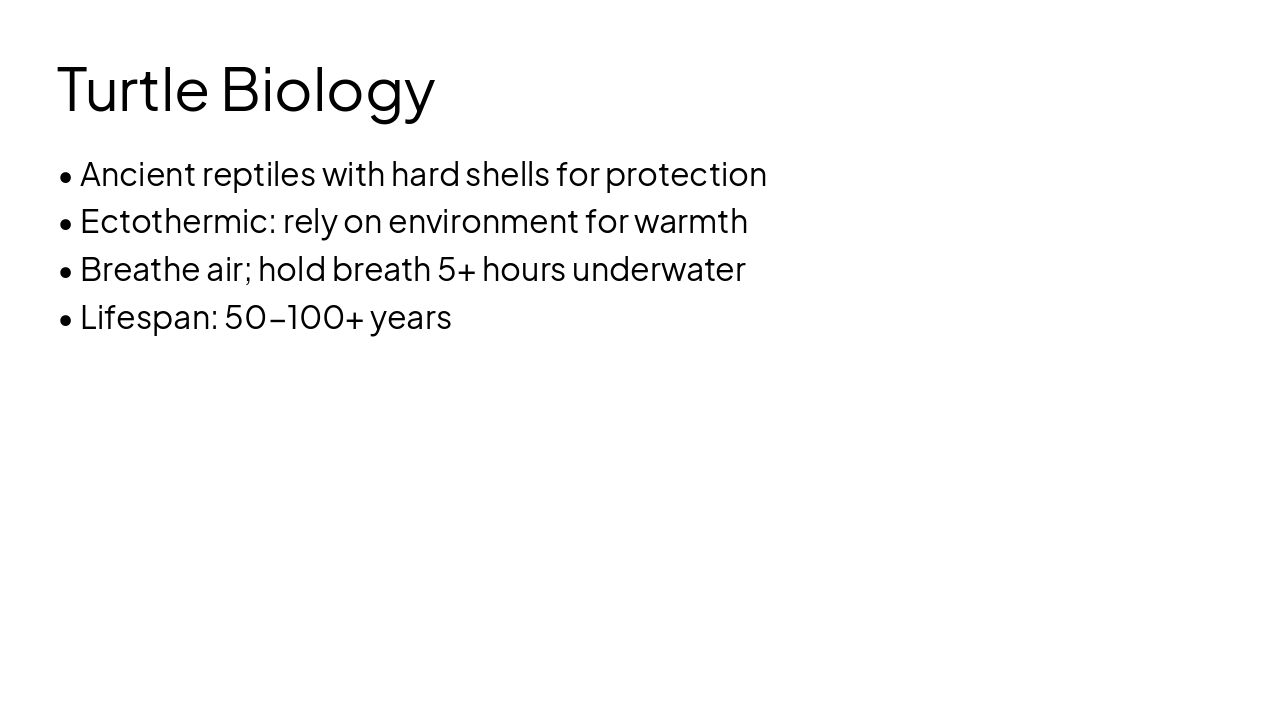 Turtles are ancient reptiles with hard shells for protection and are ectothermic, relying on their environment for warmth. They breathe air but can hold their breath underwater for 5+ hours and live 50-100+ years.