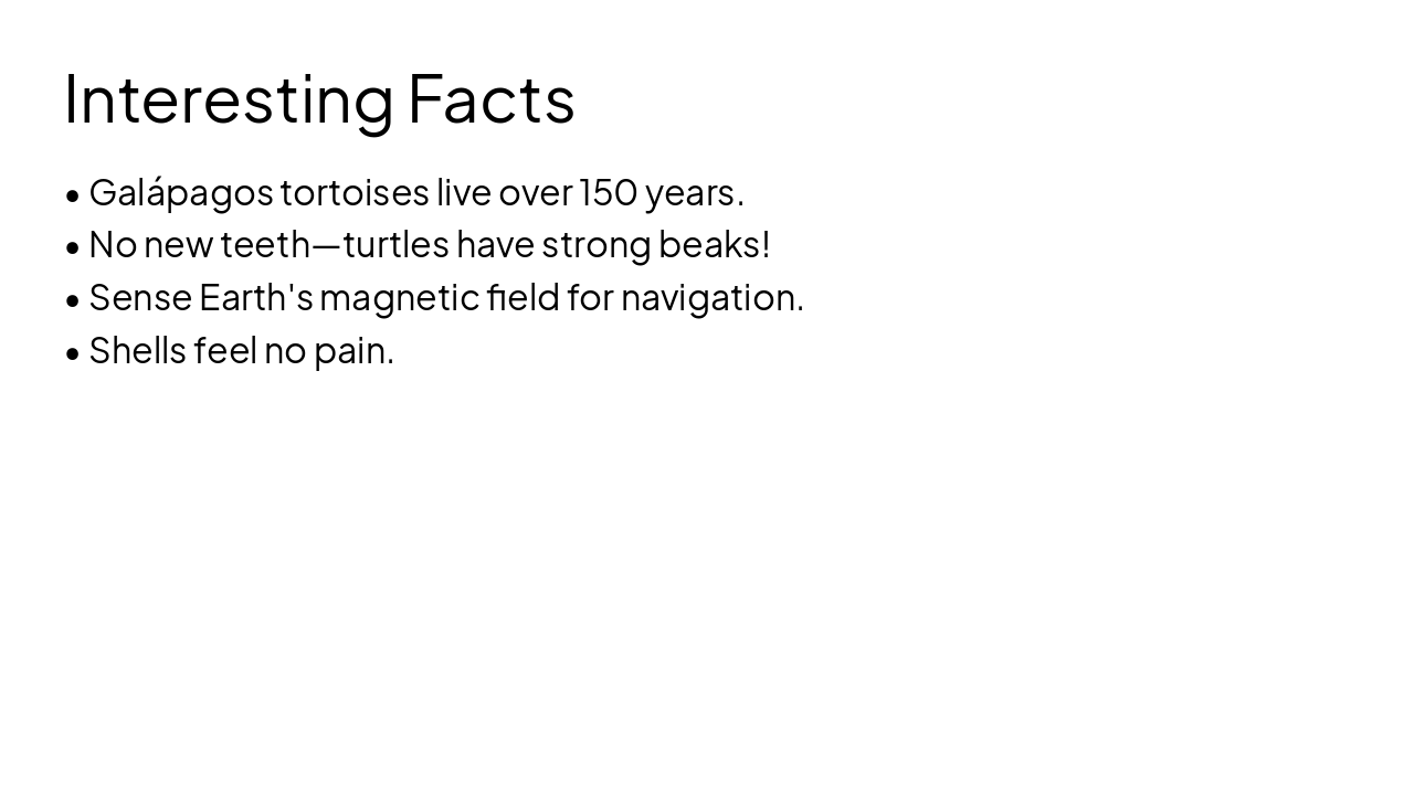 Galápagos tortoises live over 150 years and use strong beaks instead of replaceable teeth. Turtles sense Earth's magnetic field for navigation and feel no pain in their shells.