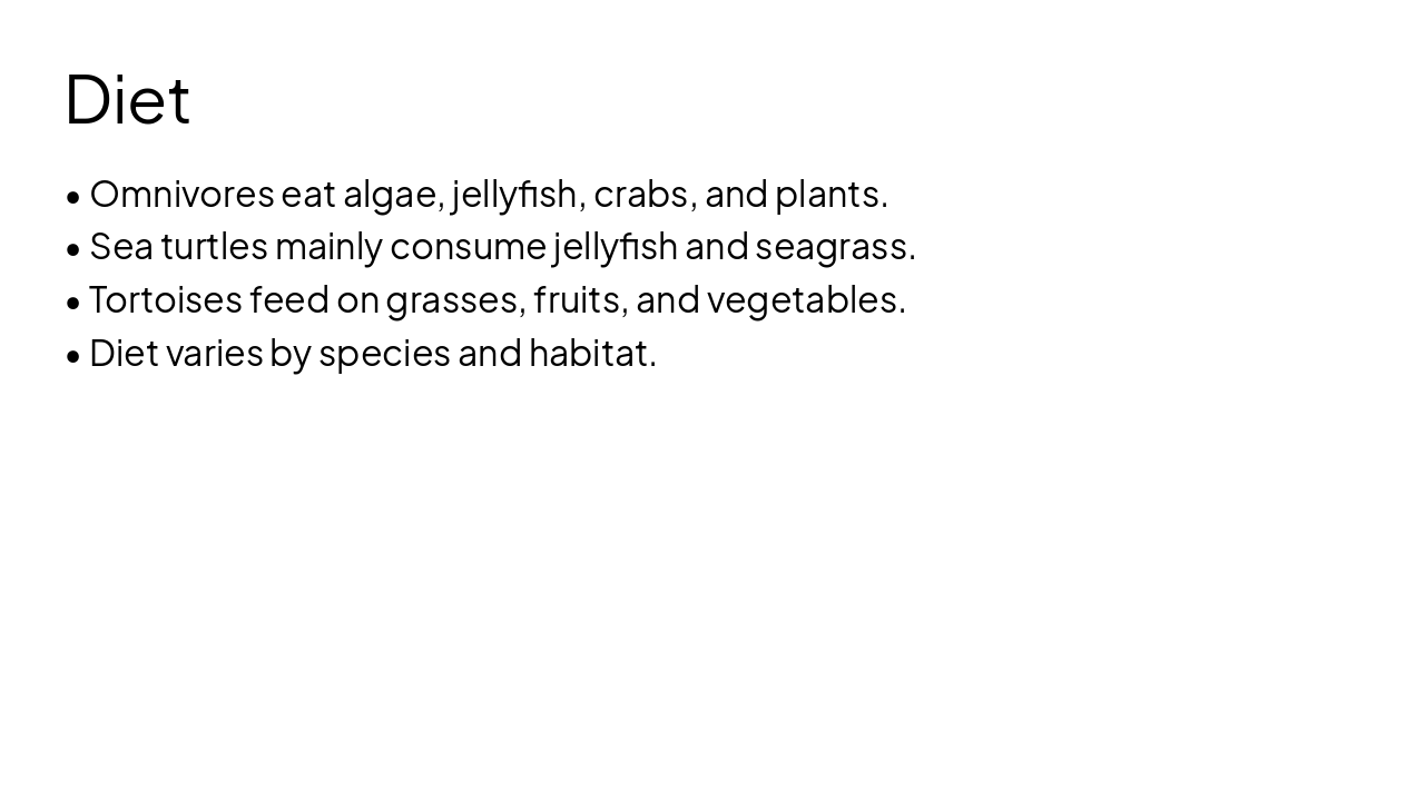 Omnivores consume algae, jellyfish, crabs, and plants, while sea turtles mainly eat jellyfish and seagrass, and tortoises feed on grasses, fruits, and vegetables. Diets vary by species and habitat.
