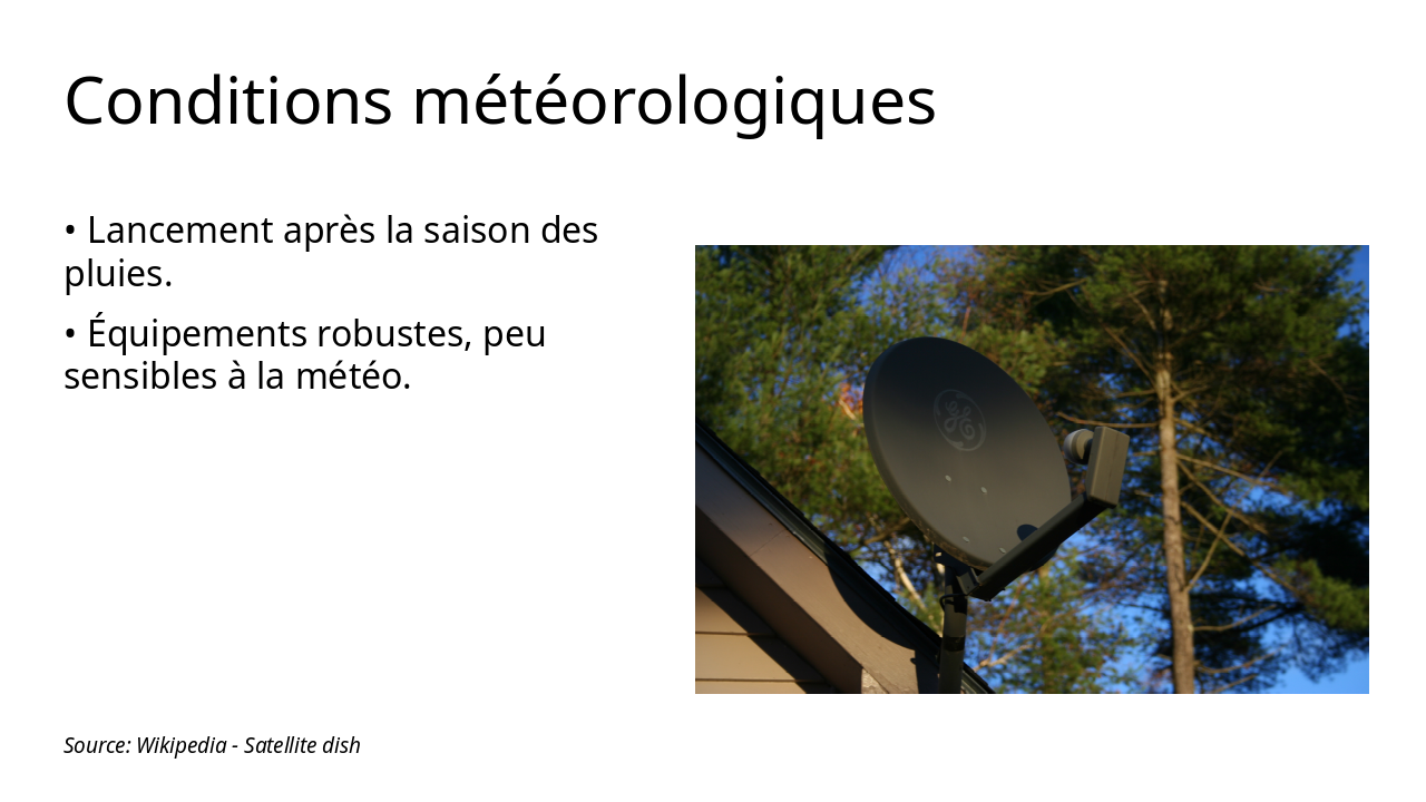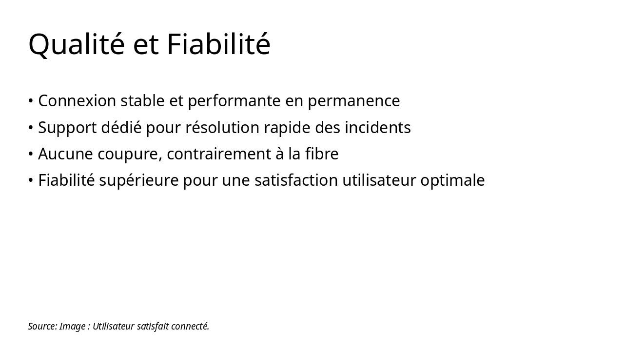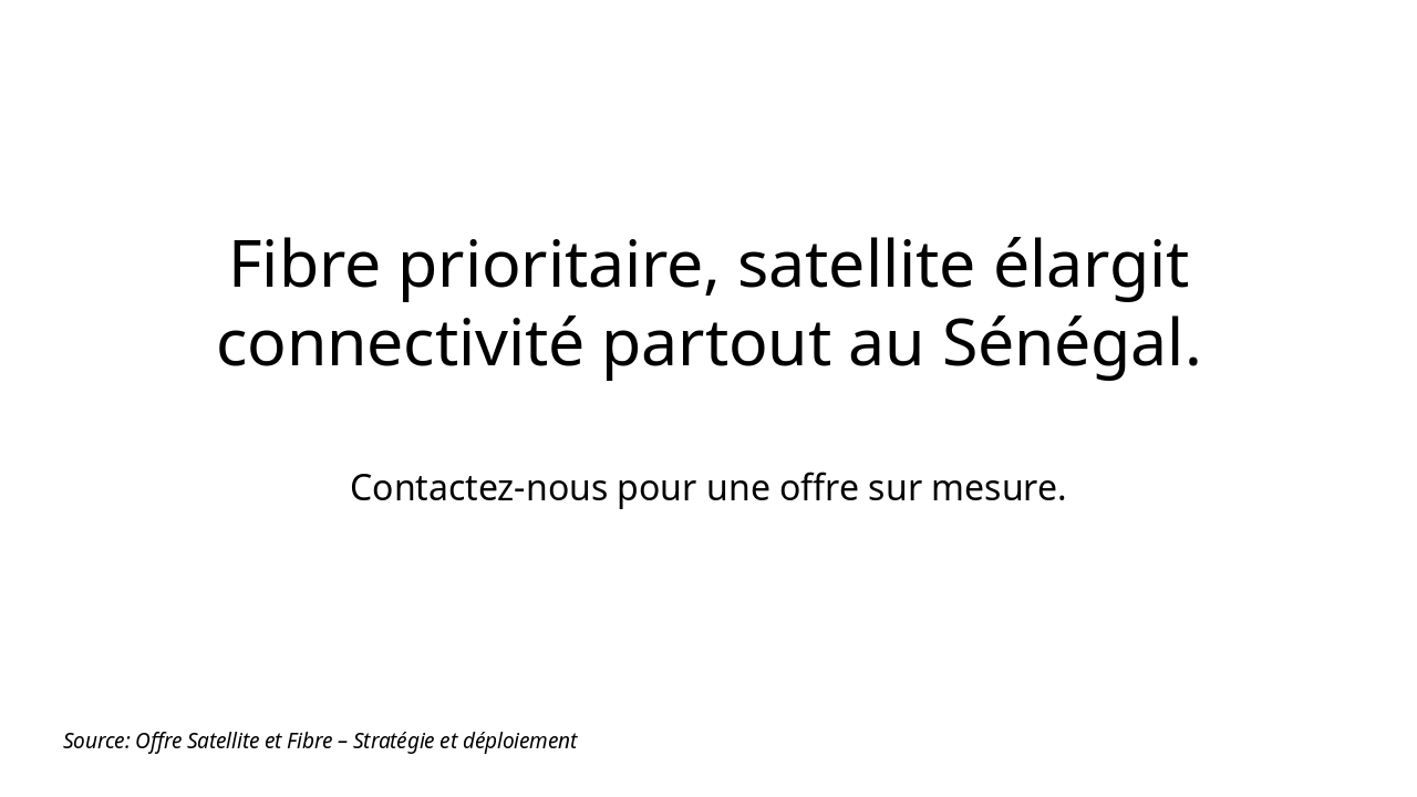 Fiabilité, impact météo, perspectives futures et conclusion. Source: Présentation PowerPoint sur l'offre satellite et fibre au Sénégal.