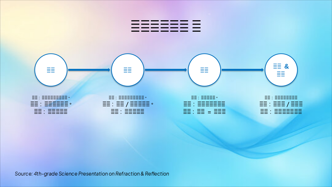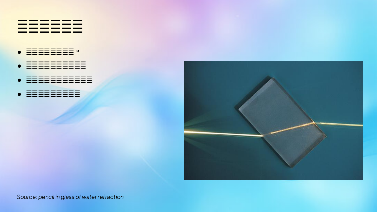Create a PowerPoint presentation for 4th-grade students in China about the science of refraction and reflection, explaining how light bends or reflects through different media. The content should include interactive experiments, simple explanations, and engaging visuals to keep the students interested while learning the concepts of refraction, reflection, and total internal reflection. The presentation should start with a fun magic trick theme to introduce the topic and end with a recap of key knowledge points and real-life examples.