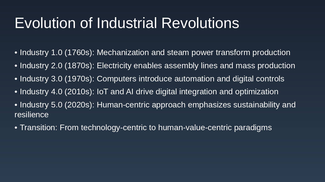 - **Industry 5.0 (2020s):** Human-centric, sustainable, resilient manufacturing