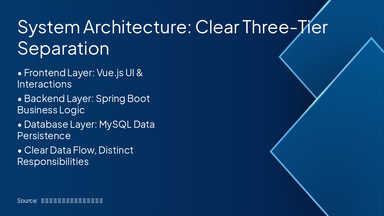 基于数据库的选课系统设计与实现 汇报型风格 幻灯片 1: 封面页 标题: 基于数据库的选课系统设计与实现 副标题: 项目架构、核心流程与成果汇报 汇报人: (您的姓名) 日期: (汇报日期) 幻灯片 2: 项目概述 标题: 项目概述:挑战与目标 核心目标: 设计并实现一个支持复杂业务规则、安全可靠的在线课程选择系统。 关键业务约束: 1. 先修课程: 学生必须先修完指定课程,才能选择更高级的课程。 2. 学分上限: 单个学期内,学生所选课程的总学分不得超过21分。 3. 时间冲突: 学生所选的多门课程之间,上课时间不允许有任何重叠。 技术栈: 后端 Spring Boot + MyBatis + Spring Security + JWT;前端 Vue.js + Element Plus;数据库 MySQL。 幻灯片 3: 系统架构设计 标题: 系统架构:清晰的三层分离模式 内容: 前端(Vue.js)、后端(Spring Boot)、数据库(MySQL)三层分离架构,数据流清晰,职责明确。 视觉: 三层架构图 幻灯片 4: 后端架构详解 标题: 后端架构:高内聚、低耦合的分层设计 内容: MVC分层结构,Controller负责请求接收,Service负责业务逻辑,Mapper负责数据访问。 视觉: 自上而下垂直堆叠的分层图 幻灯片 5: 核心流程 (1) - JWT安全认证流程 标题: 核心流程 (1) - JWT安全认证流程 内容: 登录生成JWT;前端携带JWT访问接口;后端验证JWT有效性。 视觉: 用户、前端、后端交互的时序图。 幻灯片 6: 数据库设计 - 总体思想与E-R图 标题: 数据库设计:支撑复杂业务的核心 内容: 采用实体-关系分离设计,核心实体 students, courses, enrollments, prerequisites, student_transcripts。 视觉: E-R图。 幻灯片 7-11: 数据表详解 分别介绍 students、courses、enrollments、prerequisites、student_transcripts 表的字段及作用。 幻灯片 12: 核心流程 (2) - 选课校验流程 标题: 核心流程 (2) - 选课校验流程 内容: 按“先修课程→学分上限→时间冲突→插入选课记录→更新课程人数”流程执行。 视觉: 校验流程图。 幻灯片 13: 系统功能演示 标题: 系统功能演示 内容: 登录页面、课程列表、选课失败与成功提示、“我的课程”截图展示。 视觉: 截图及箭头标注。 幻灯片 14: 总结与展望 标题: 总结与展望 内容: 系统完成度高、安全稳定;未来扩展教师/管理员角色、性能优化、用户体验提升。 幻灯片 15: end 标题: 谢谢观看,敬请提问! 风格说明: 汇报型风格,简洁专业,标题明确,色调建议使用蓝白科技风,强调逻辑与结构清晰。