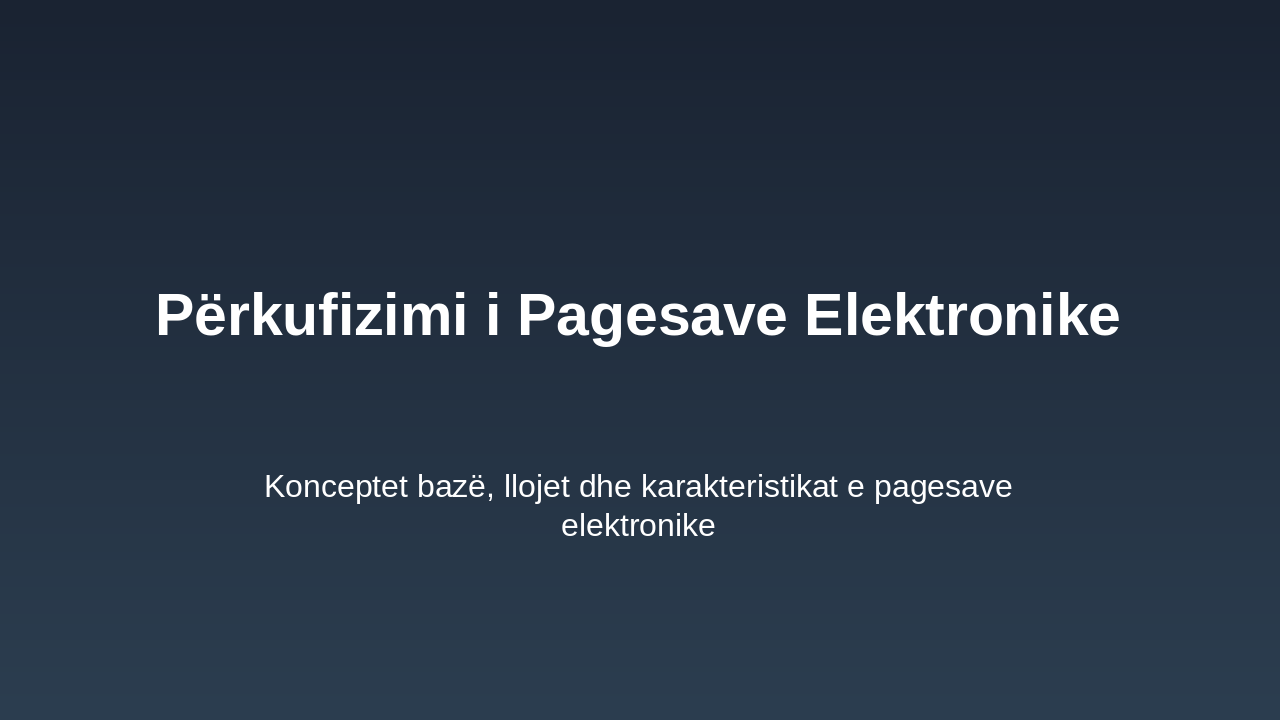 This title slide presents the main title: "Roli i Sistemit Elektronik të Pagesave në Cilësinë e Shërbimit për Klientët," focusing on the role of electronic payment systems in customer service quality. The subtitle identifies it as "Diploma e [Emri Juaj]. Universiteti [Emri]. Data: [Data]," marking it as a university diploma thesis.