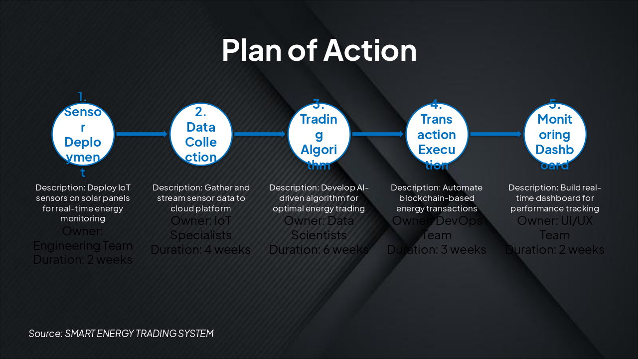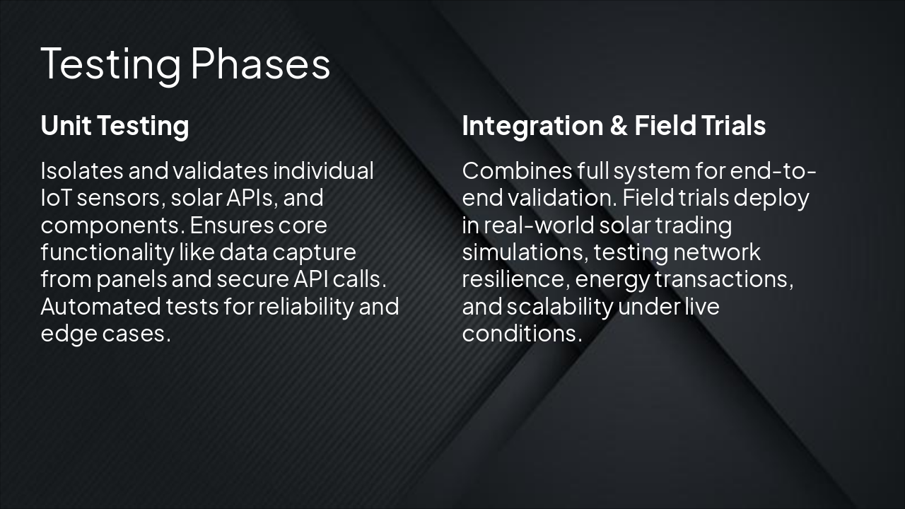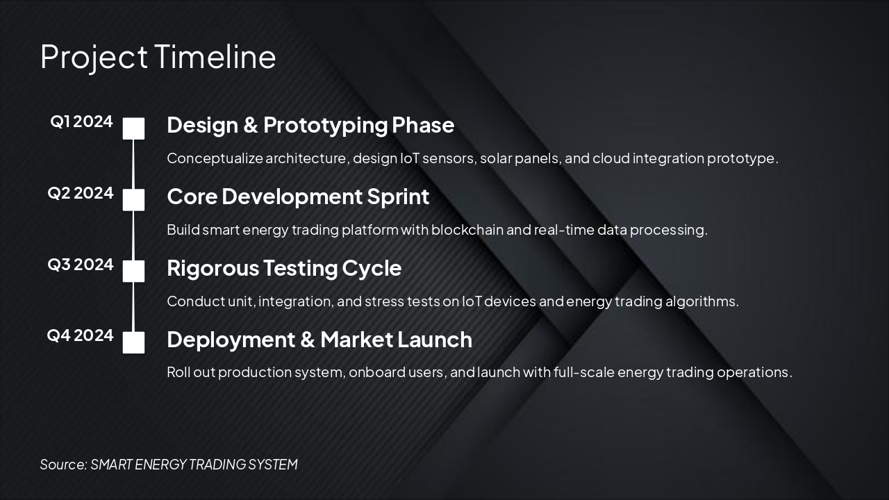 Q1 2024: Design & Prototyping Phase Conceptualize architecture, design IoT sensors, solar panels, and cloud integration prototype. Q2 2024: Core Development Sprint Build smart energy trading platform with blockchain and real-time data processing. Q3 2024: Rigorous Testing Cycle Conduct unit, integration, and stress tests on IoT devices and energy trading algorithms. Q4 2024: Deployment & Market Launch Roll out production system, onboard users, and launch with full-scale energy trading operations.